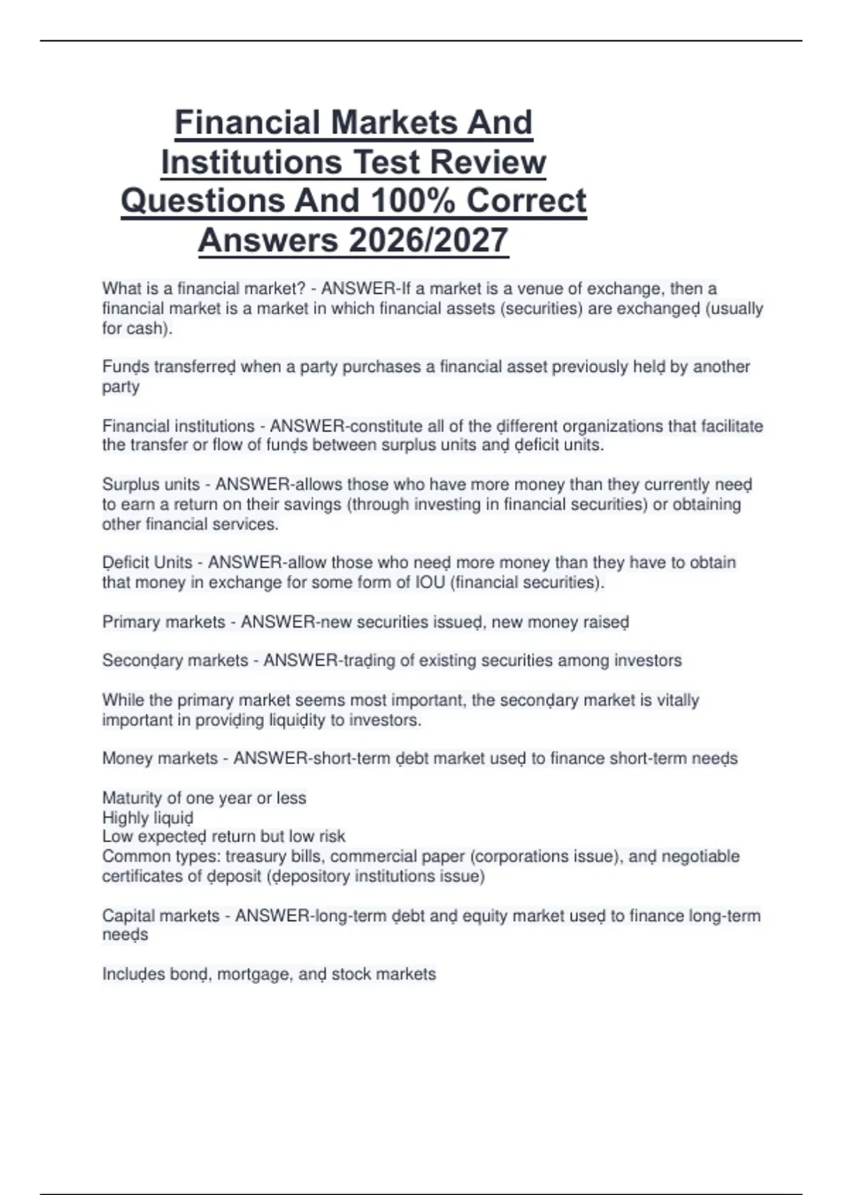 This document contains test review questions with fully correct answers covering the key topics of Financial Markets and Institutions for the 2026/2027 academic year. It supports exam preparation by helping students practice exam-style questions and reinforce their understanding of core concepts, theories, and applications commonly assessed in tests.