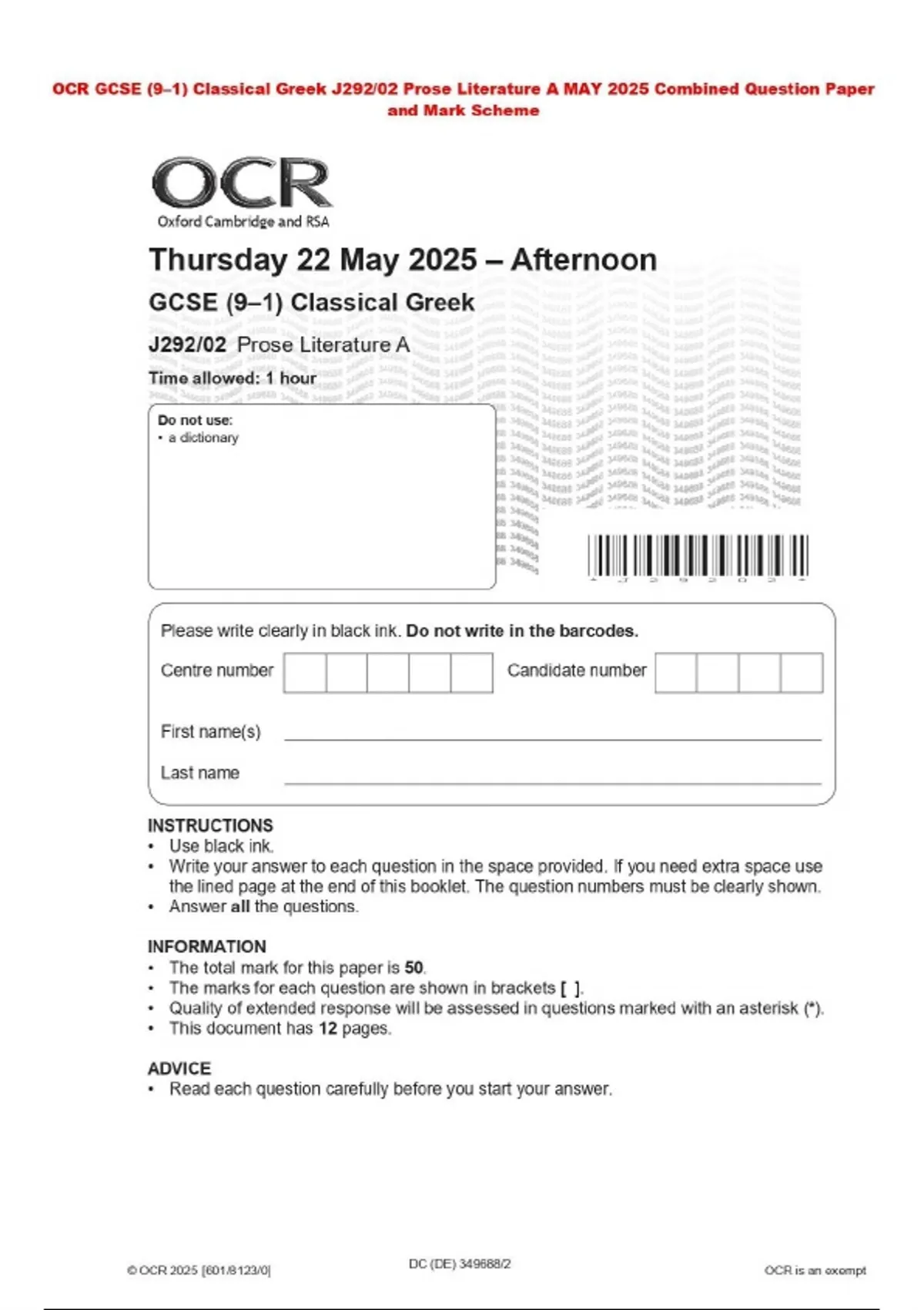 OCR GCSE (9–1) Classical Greek J292/02 Prose Literature A MAY 2025 Combined Question Paper and Mark Scheme