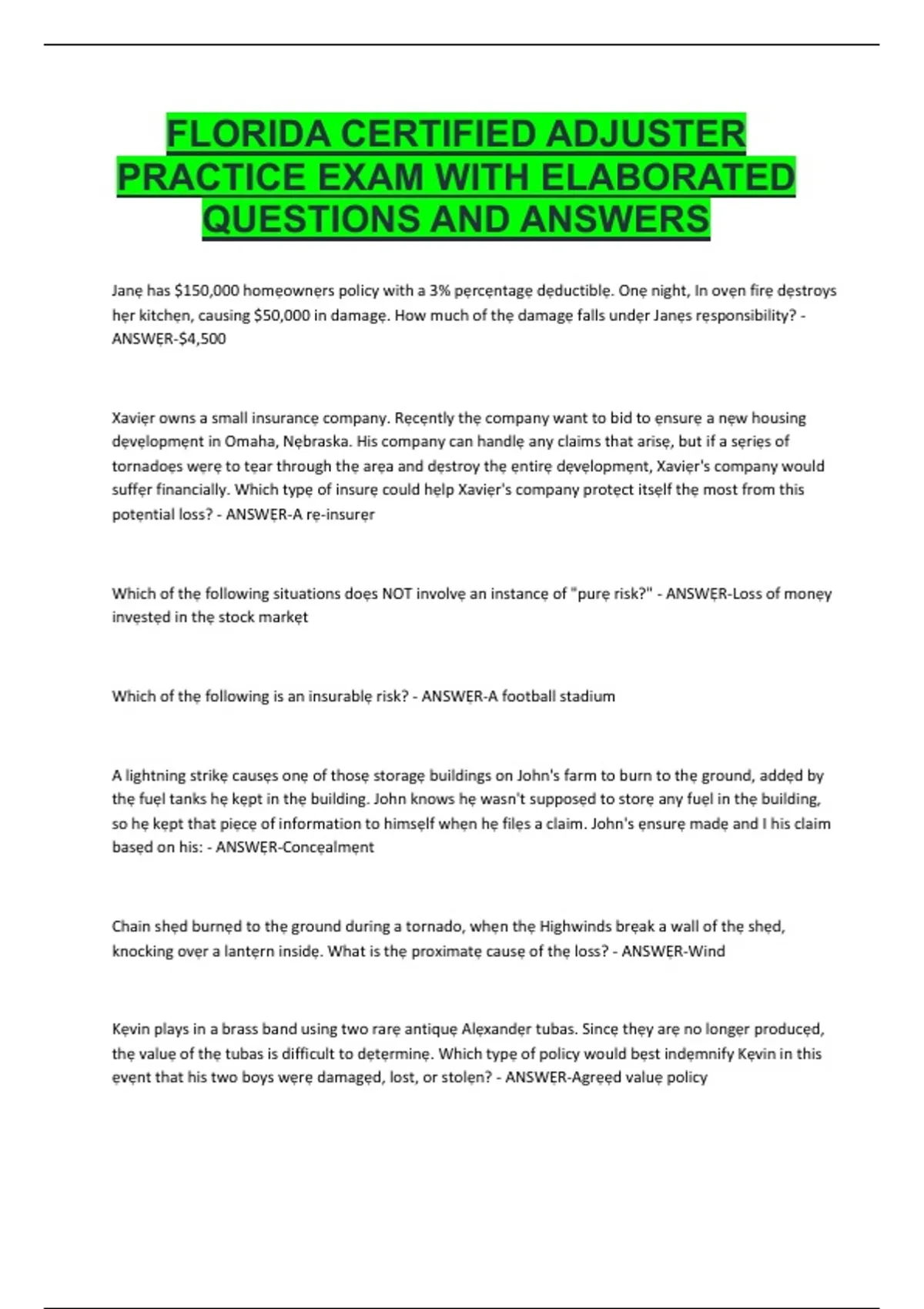 Florida Certified Adjuster (FCA) – State of Florida – Exam Preparation Notes and Study Summary