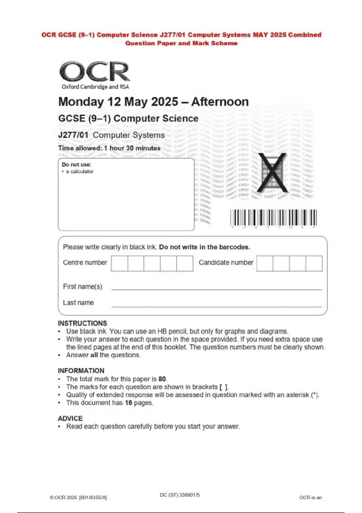OCR GCSE (9–1) Computer Science J277/01 Computer Systems MAY 2025 Combined Question Paper and Mark Scheme
