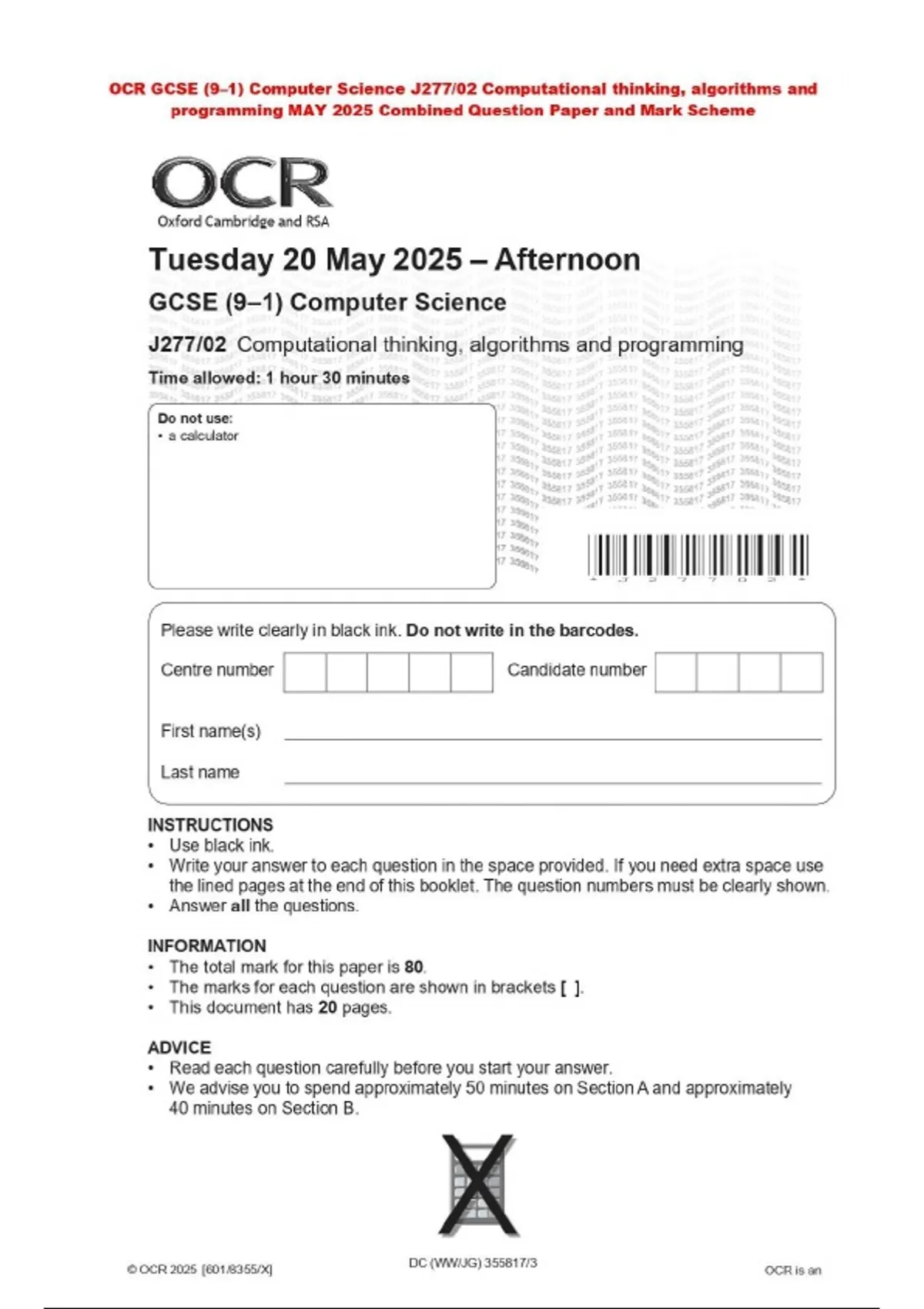 OCR GCSE (9–1) Computer Science J277/02 Computational thinking, algorithms and programming MAY 2025 Combined Question Paper and Mark Scheme