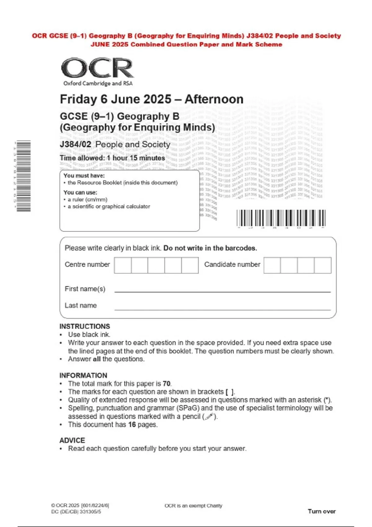 OCR GCSE (9–1) Geography B (Geography for Enquiring Minds) J384/02 People and Society JUNE 2025 Combined Question Paper and Mark Scheme