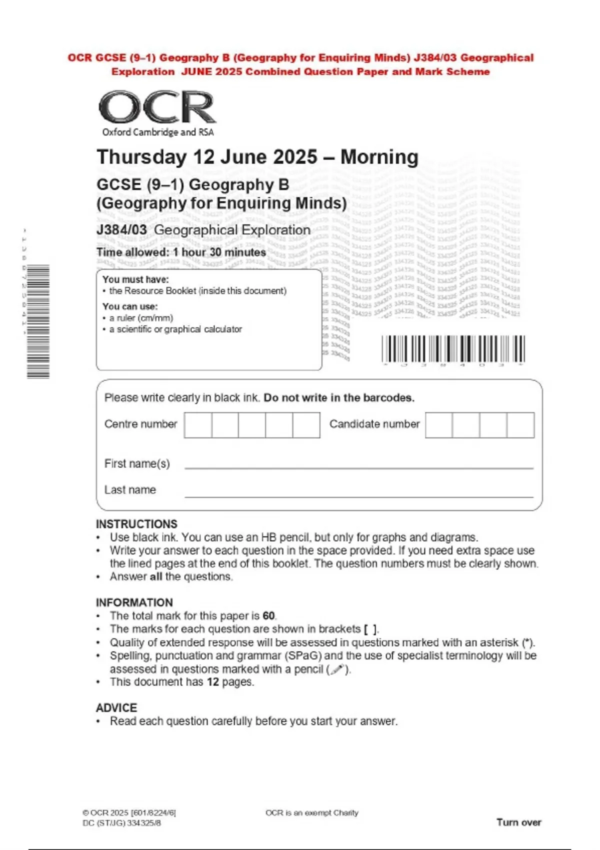 OCR GCSE (9–1) Geography B (Geography for Enquiring Minds) J384/03 Geographical Exploration JUNE 2025 Combined Question Paper and Mark Scheme