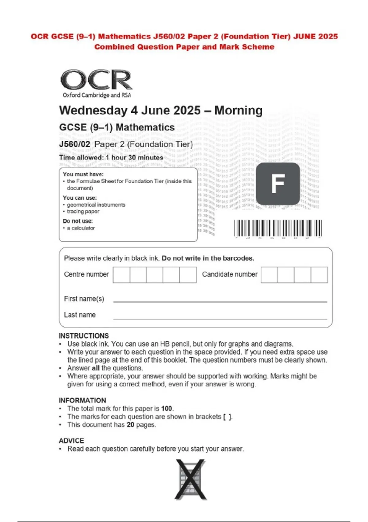 OCR GCSE (9–1) Mathematics J560/02 Paper 2 (Foundation Tier) JUNE 2025 Combined Question Paper and Mark Scheme