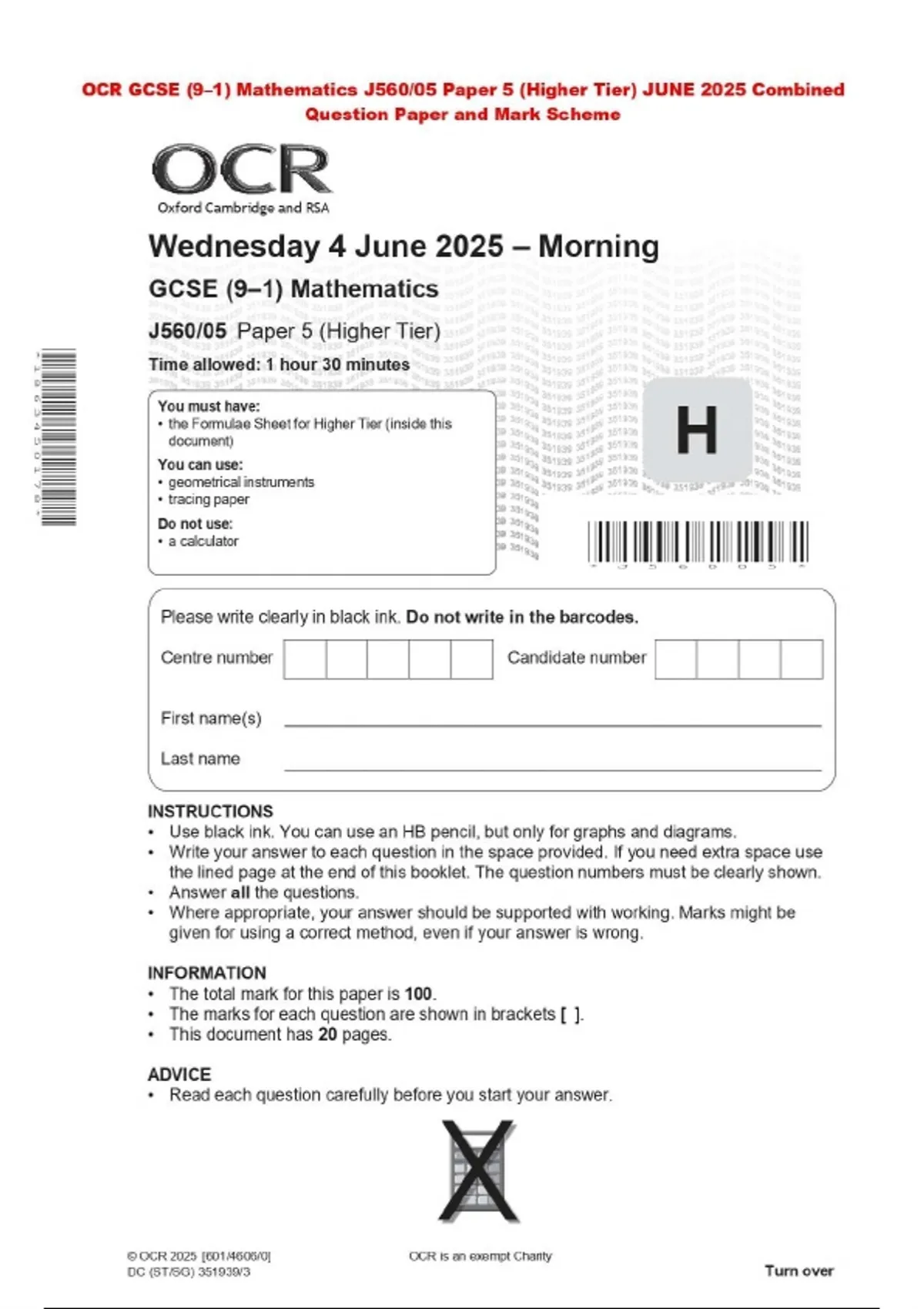 OCR GCSE (9–1) Mathematics J560/05 Paper 5 (Higher Tier) JUNE 2025 Combined Question Paper and Mark Scheme