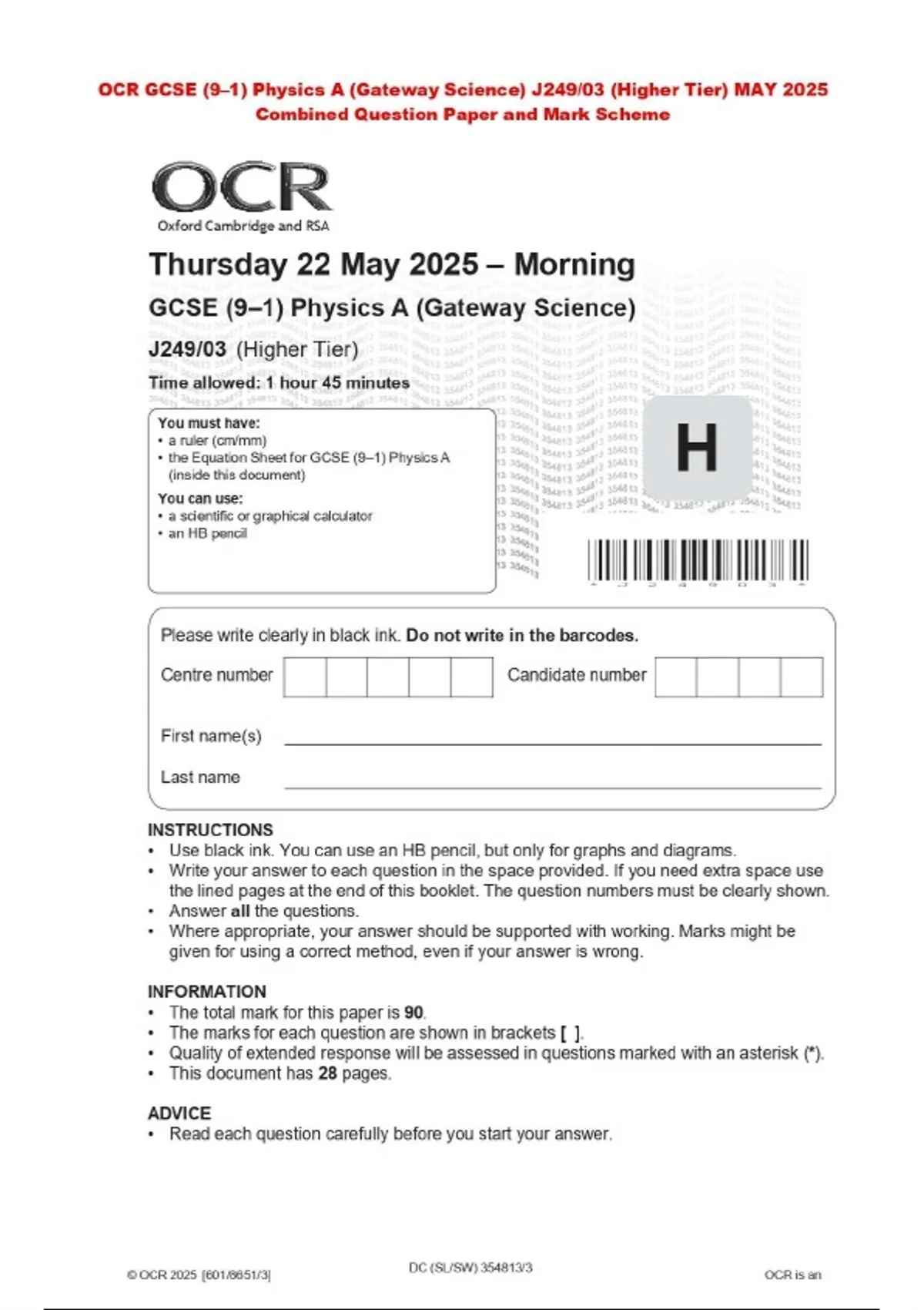 OCR GCSE (9–1) Physics A (Gateway Science) J249/03 (Higher Tier) MAY 2025 Combined Question Paper and Mark Scheme