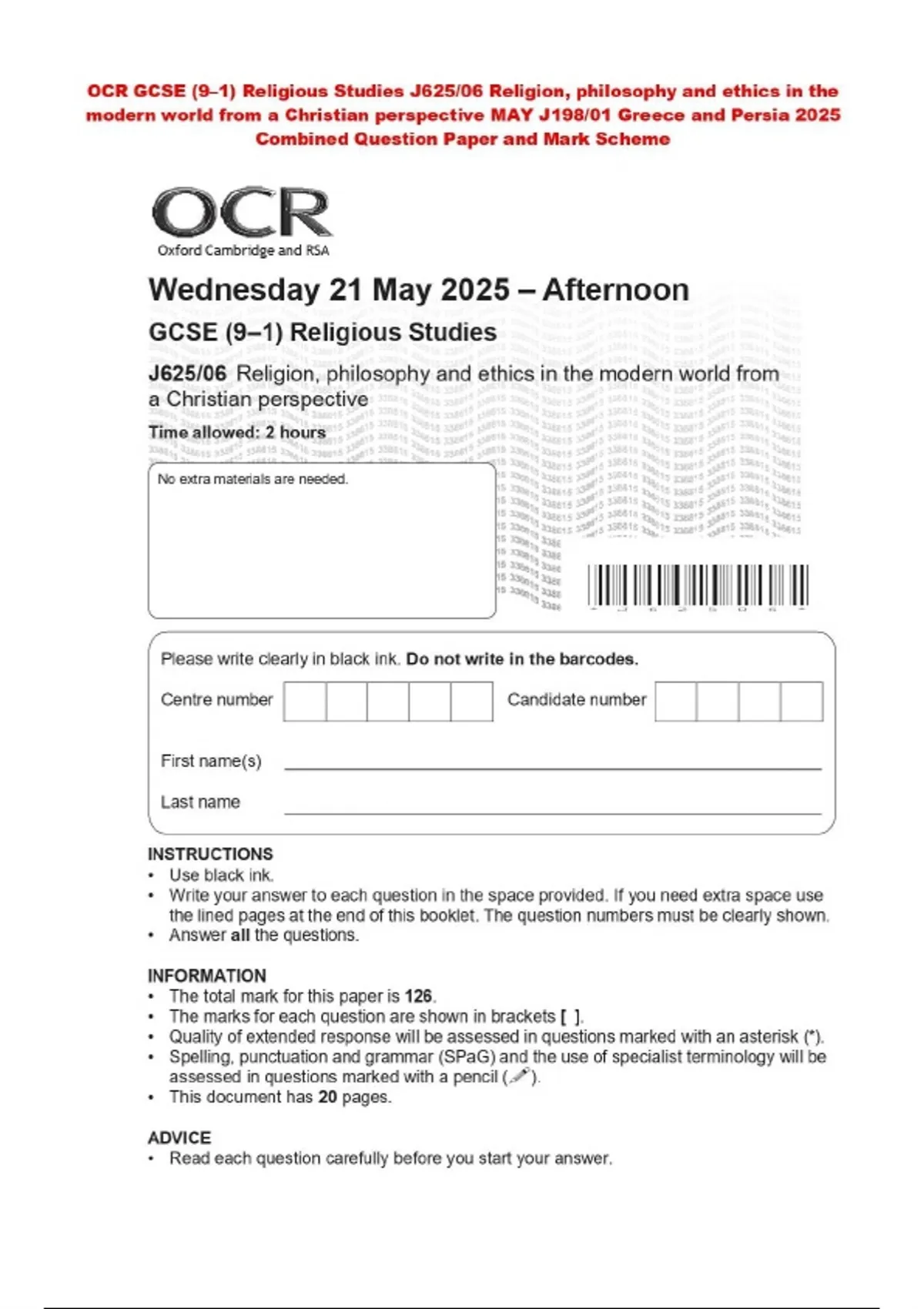 OCR GCSE (9–1) Religious Studies J625/06 Religion, philosophy and ethics in the modern world from a Christian perspective MAY J198/01 Greece and Persia 2025 Combined Question Paper and Mark Scheme