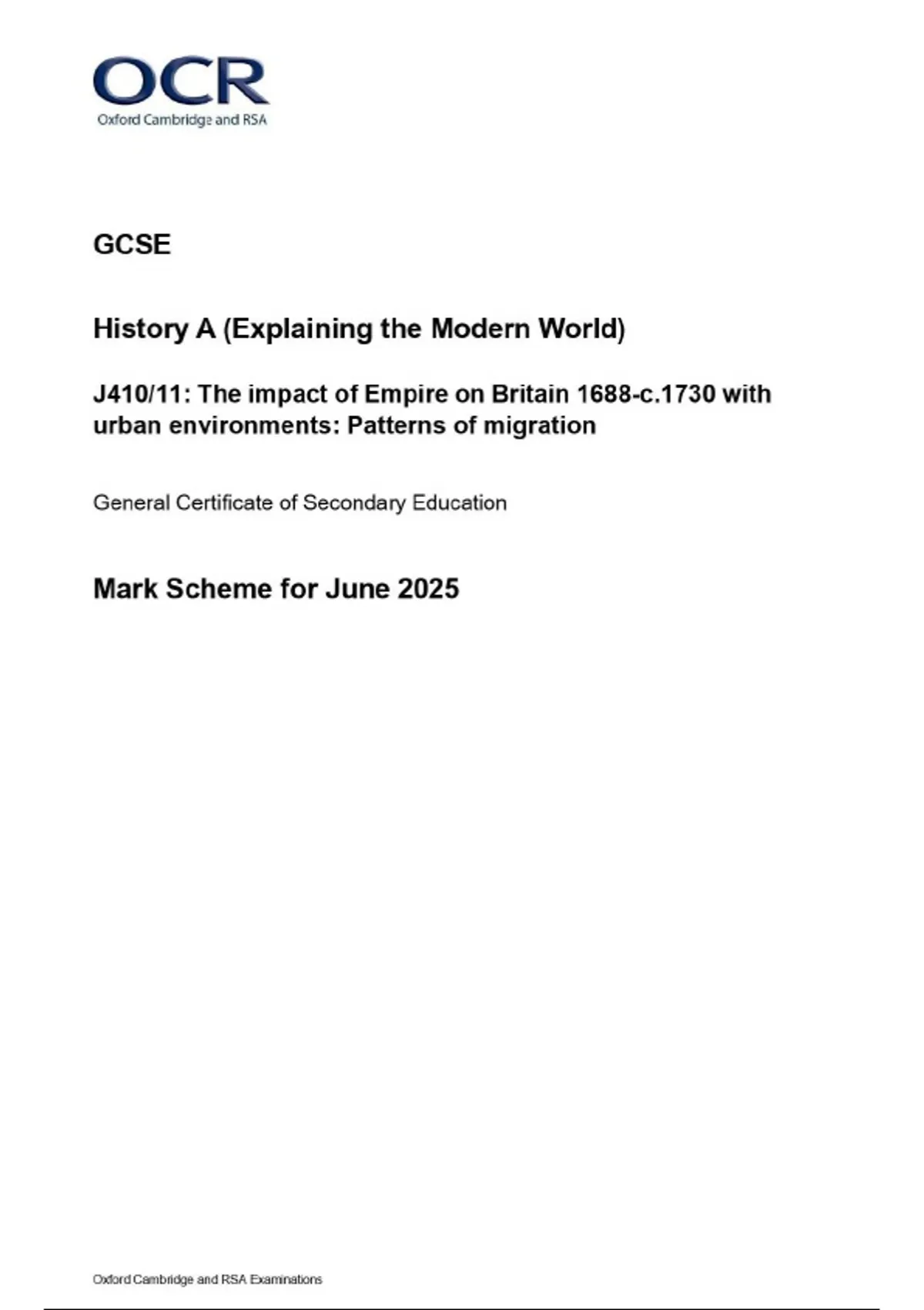 OCR GCSE History A (Explaining the Modern World) J410/11: The impact of Empire on Britain 1688-c.1730 with urban environments: Patterns of migration General Certificate of Secondary Education Mark Scheme for June 2025
