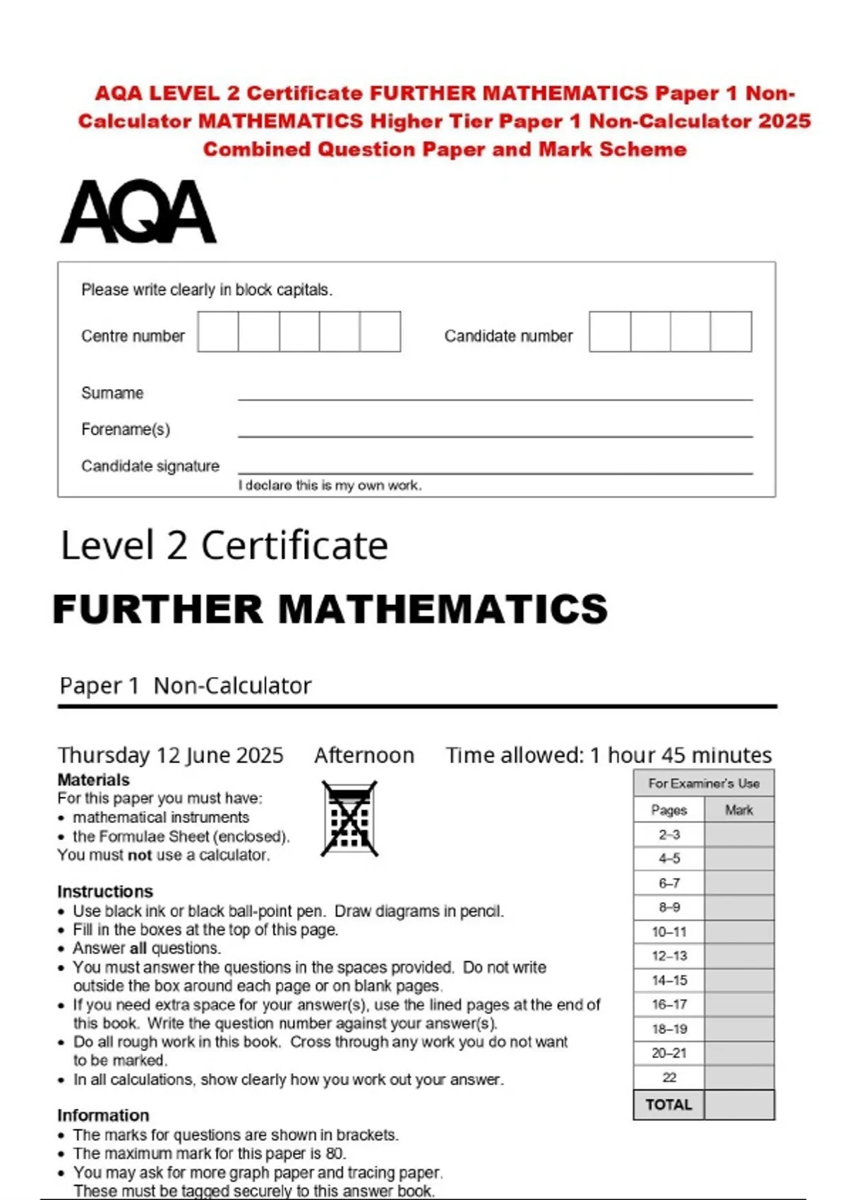 AQA LEVEL 2 Certificate FURTHER MATHEMATICS Paper 1 Non Calculator MATHEMATICS Higher Tier Paper 1 Non-Calculator 2025 Combined Question Paper and Mark Scheme