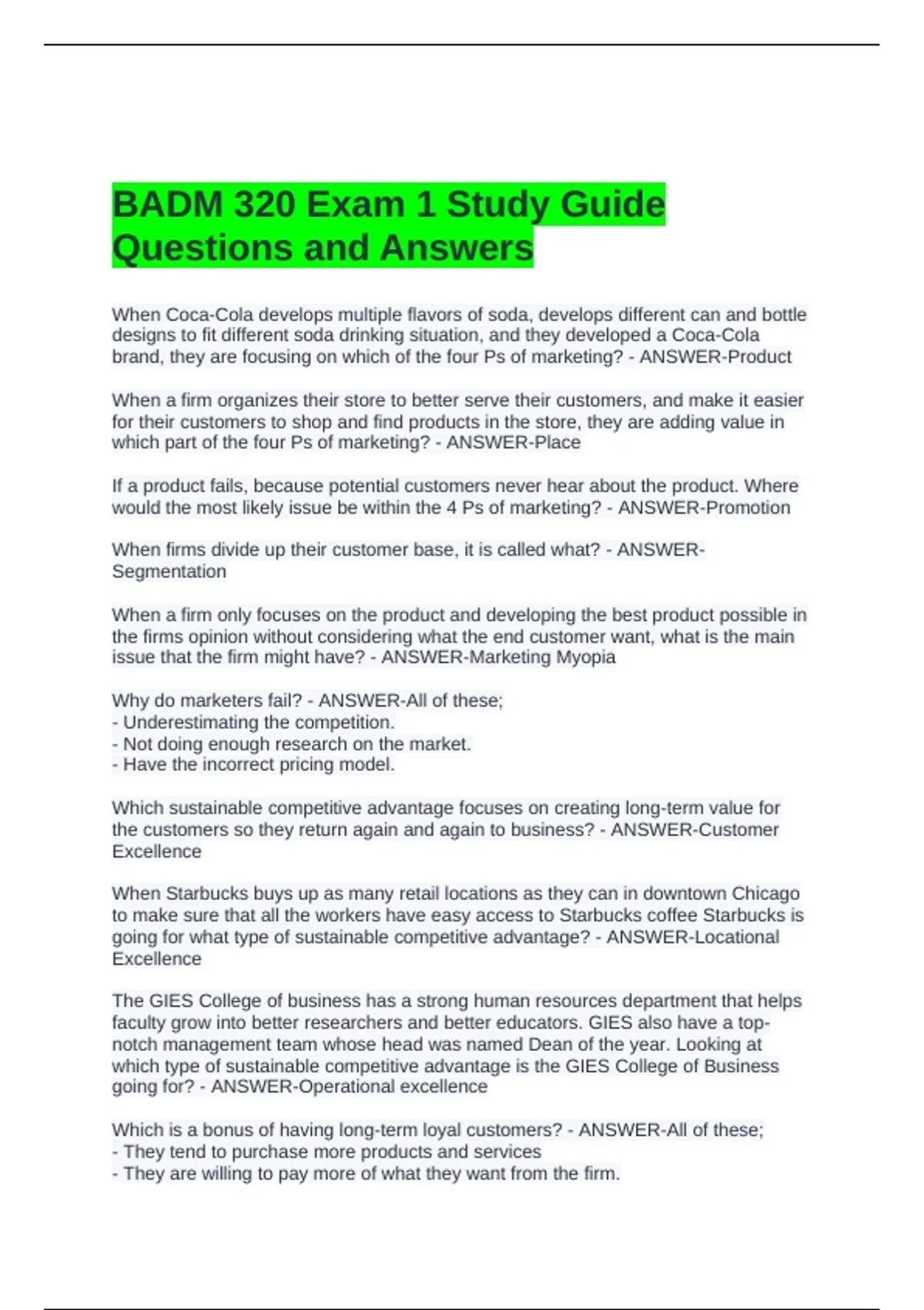 BADM 320 Exam 1 Study Guide Questions and Answers