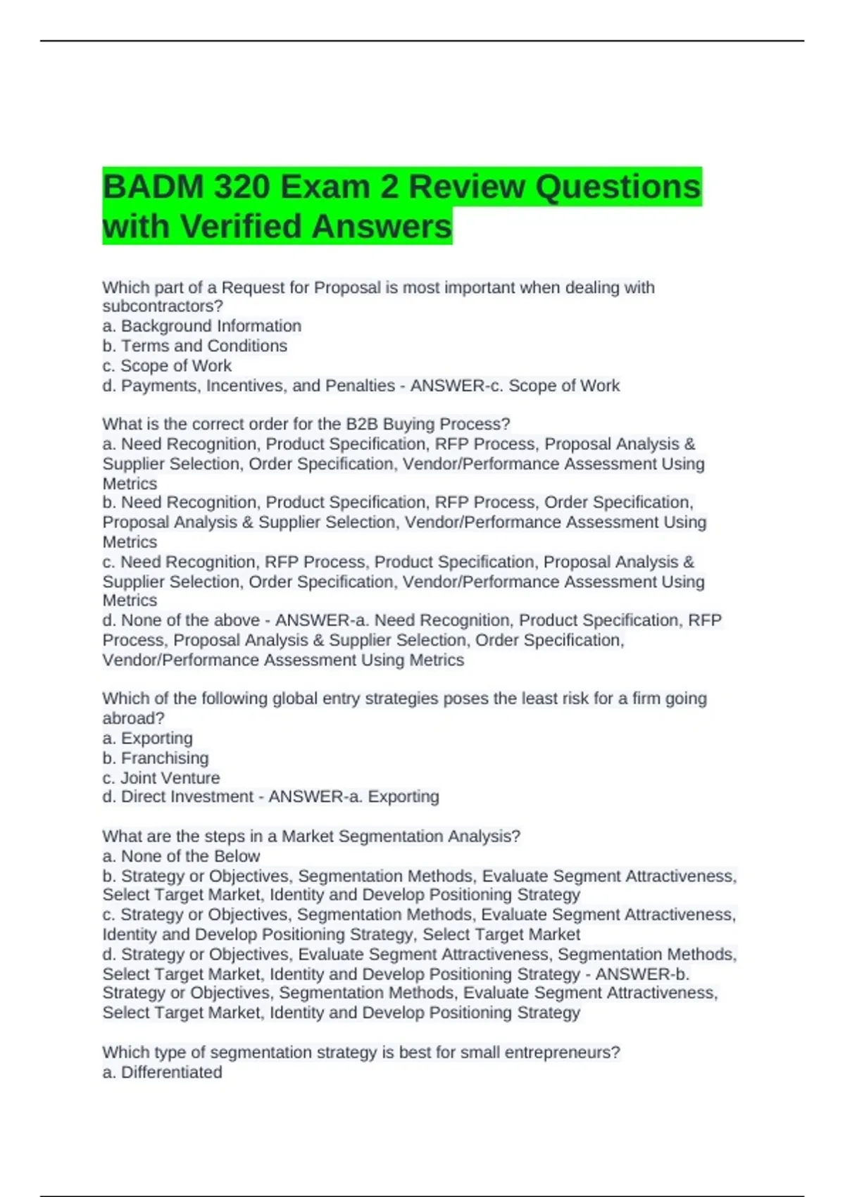 BADM 320 Exam 2 Review Questions with Verified Answers