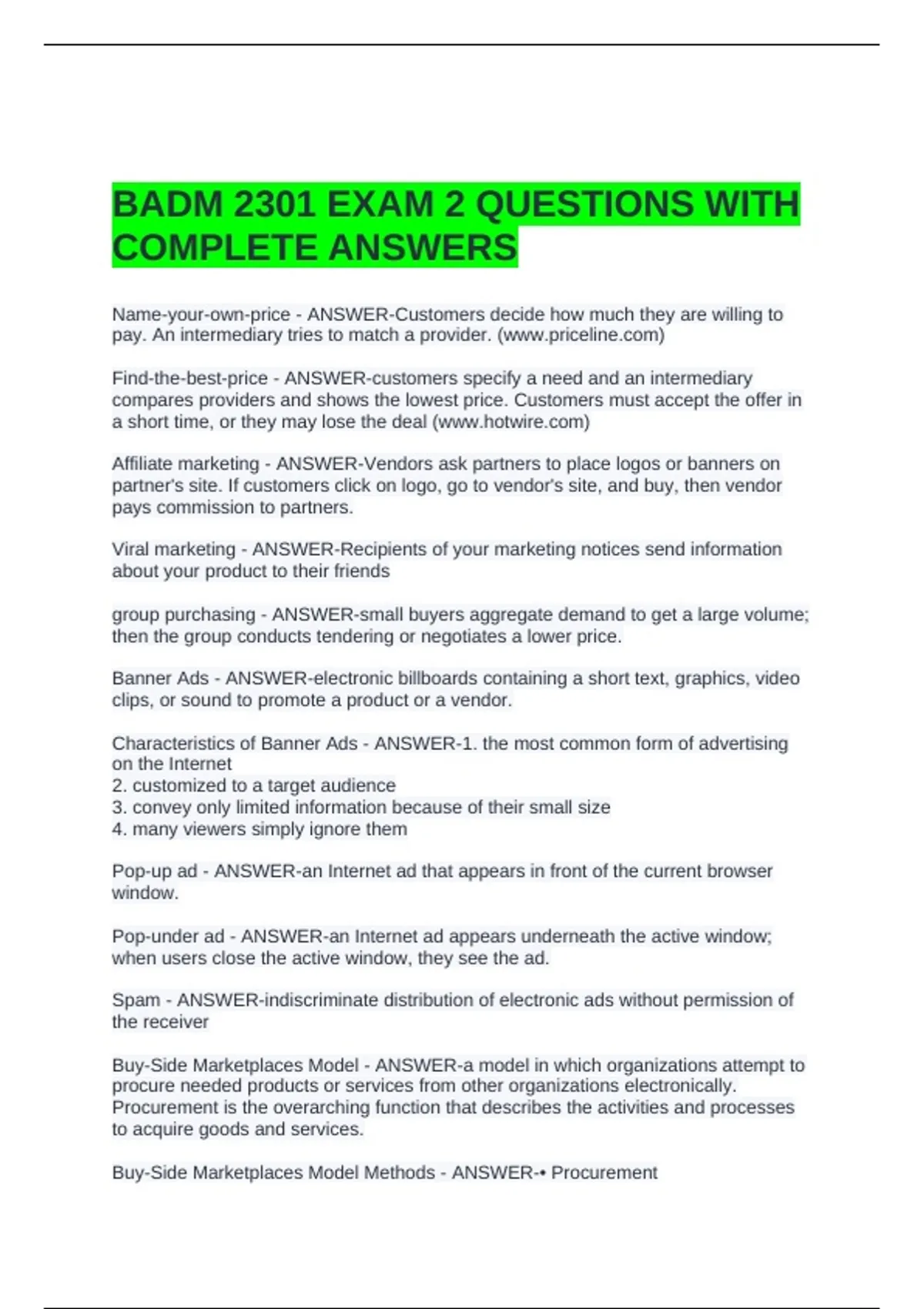 BADM 2301 EXAM 2 QUESTIONS WITH COMPLETE ANSWERS