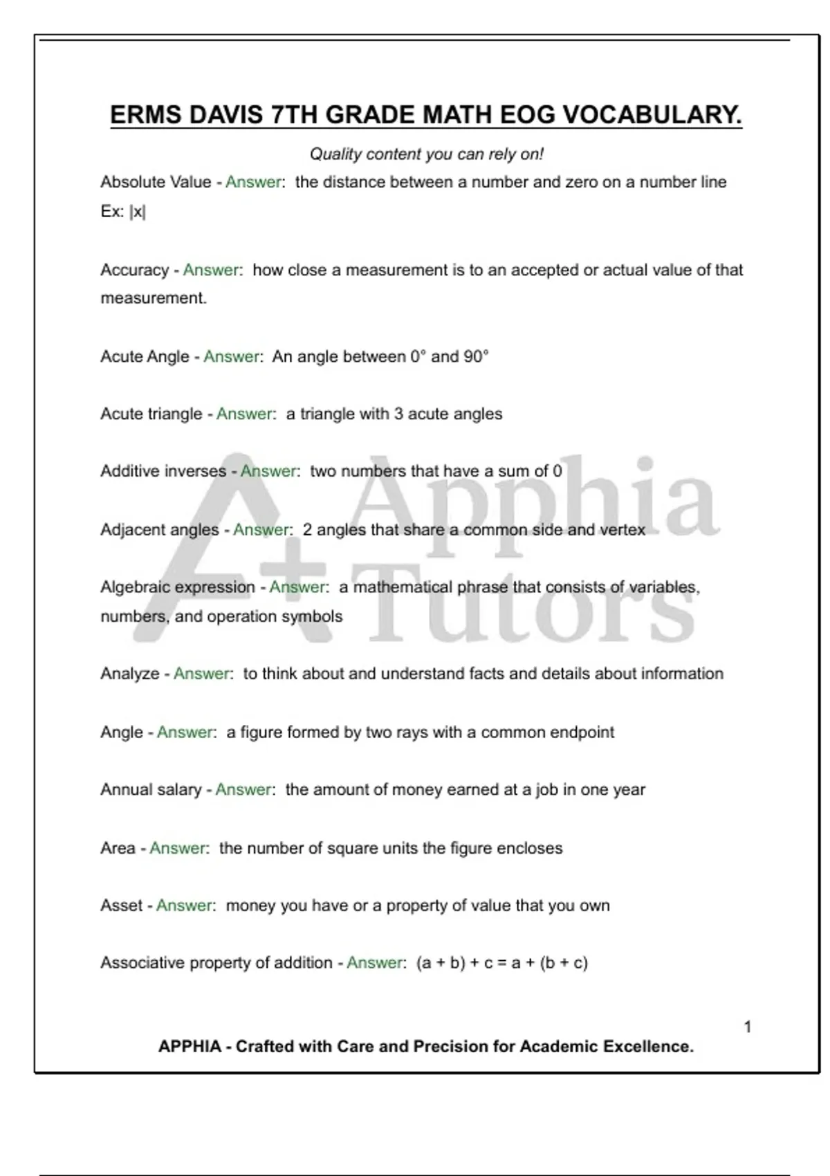 ERMS DAVIS 7TH GRADE MATH EOG VOCABULARY. Quality content you can rely on!