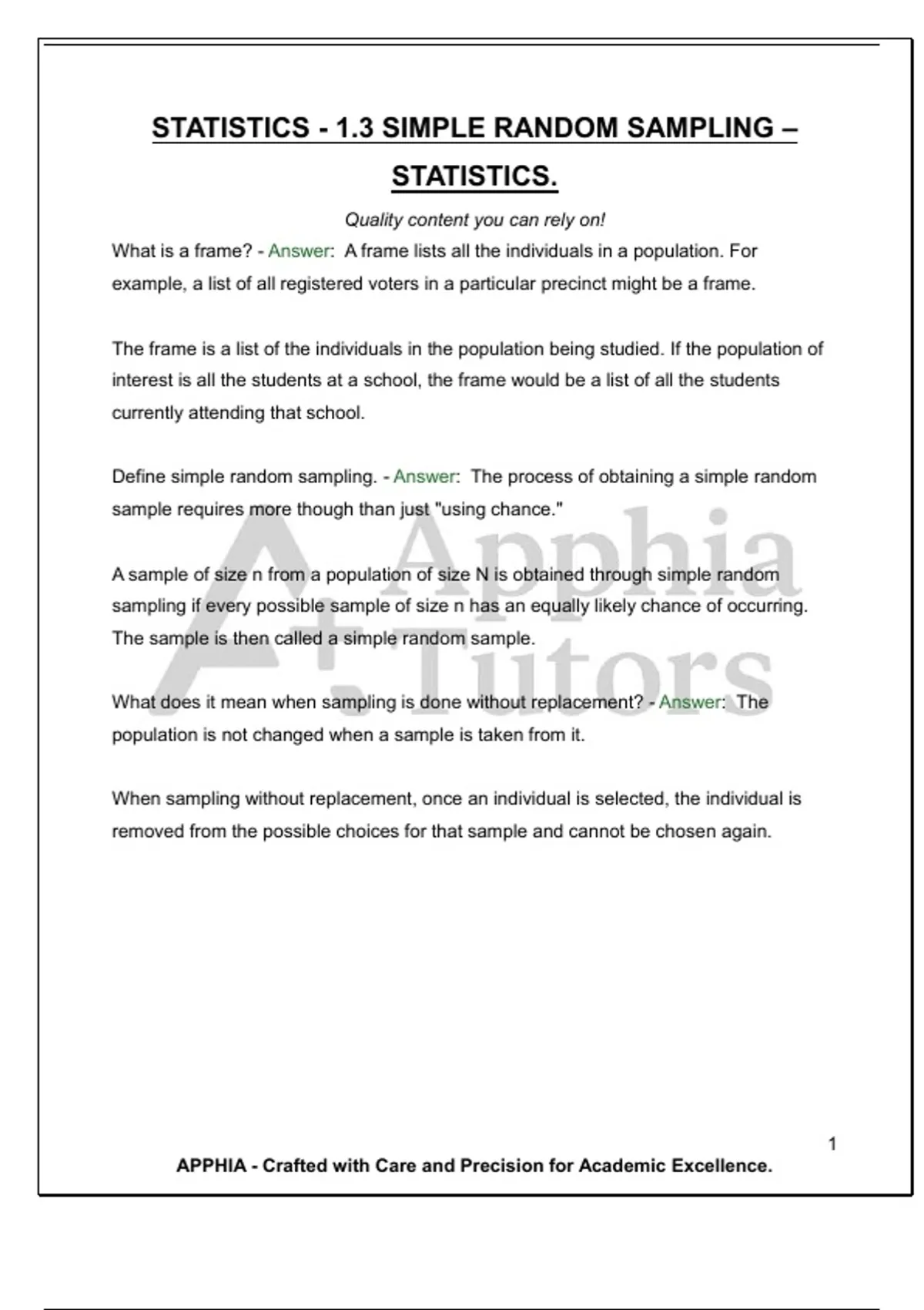 STATISTICS - 1.3 SIMPLE RANDOM SAMPLING – STATISTICS. Quality content you can rely on!