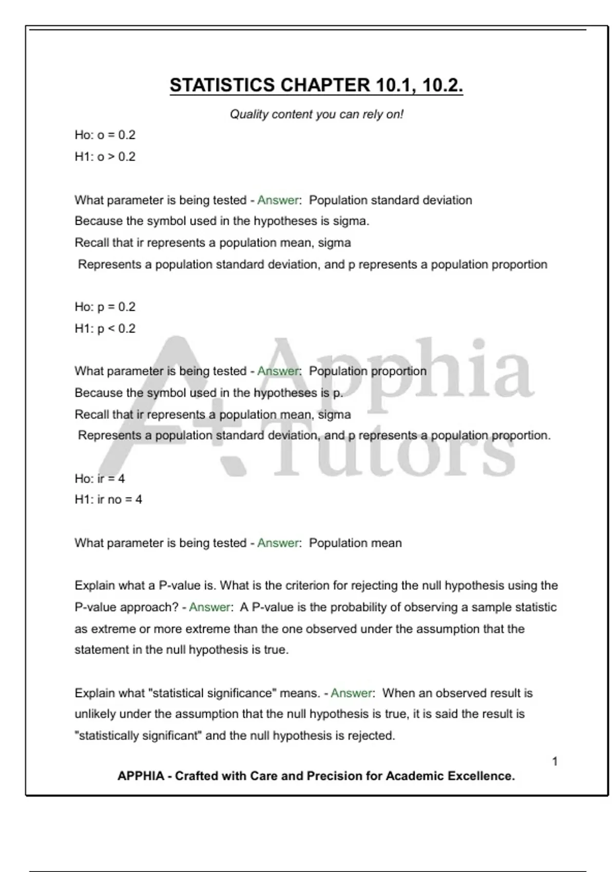 What parameter is being tested - Answer: Population mean