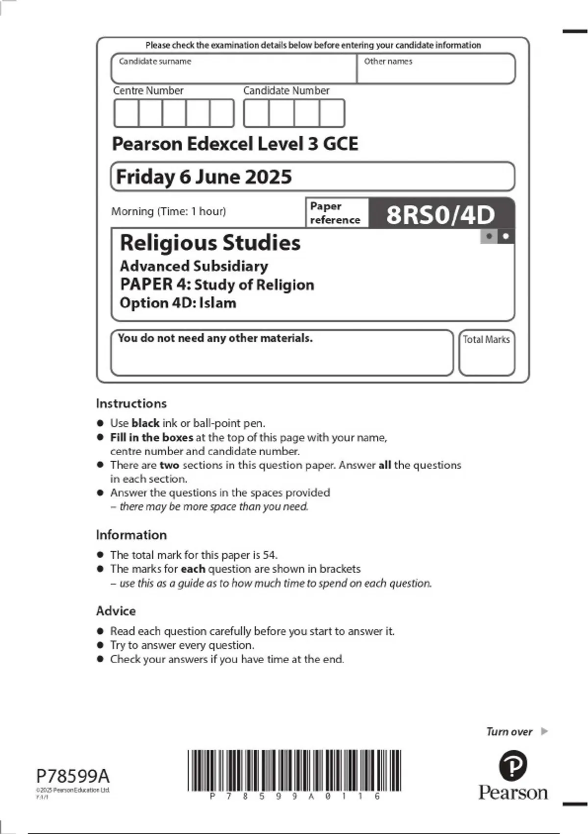 025 Pearson Edexcel Level 3 GCE 8RS0/4D Religious Studies Advanced Subsidiary PAPER 4: Study of Religion Option 4D: Islam QUESTION PAPER & MARKSCHEME (MERGED)