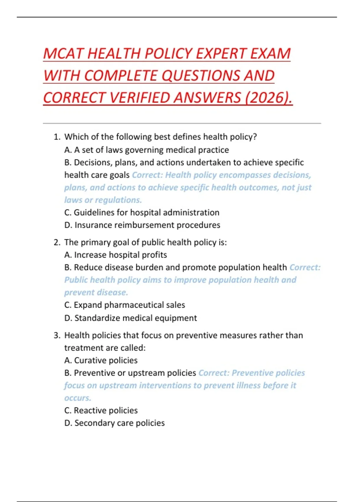 MCAT HEALTH POLICY EXPERT EXAM WITH COMPLETE QUESTIONS AND CORRECT VERIFIED ANSWERS (2026).