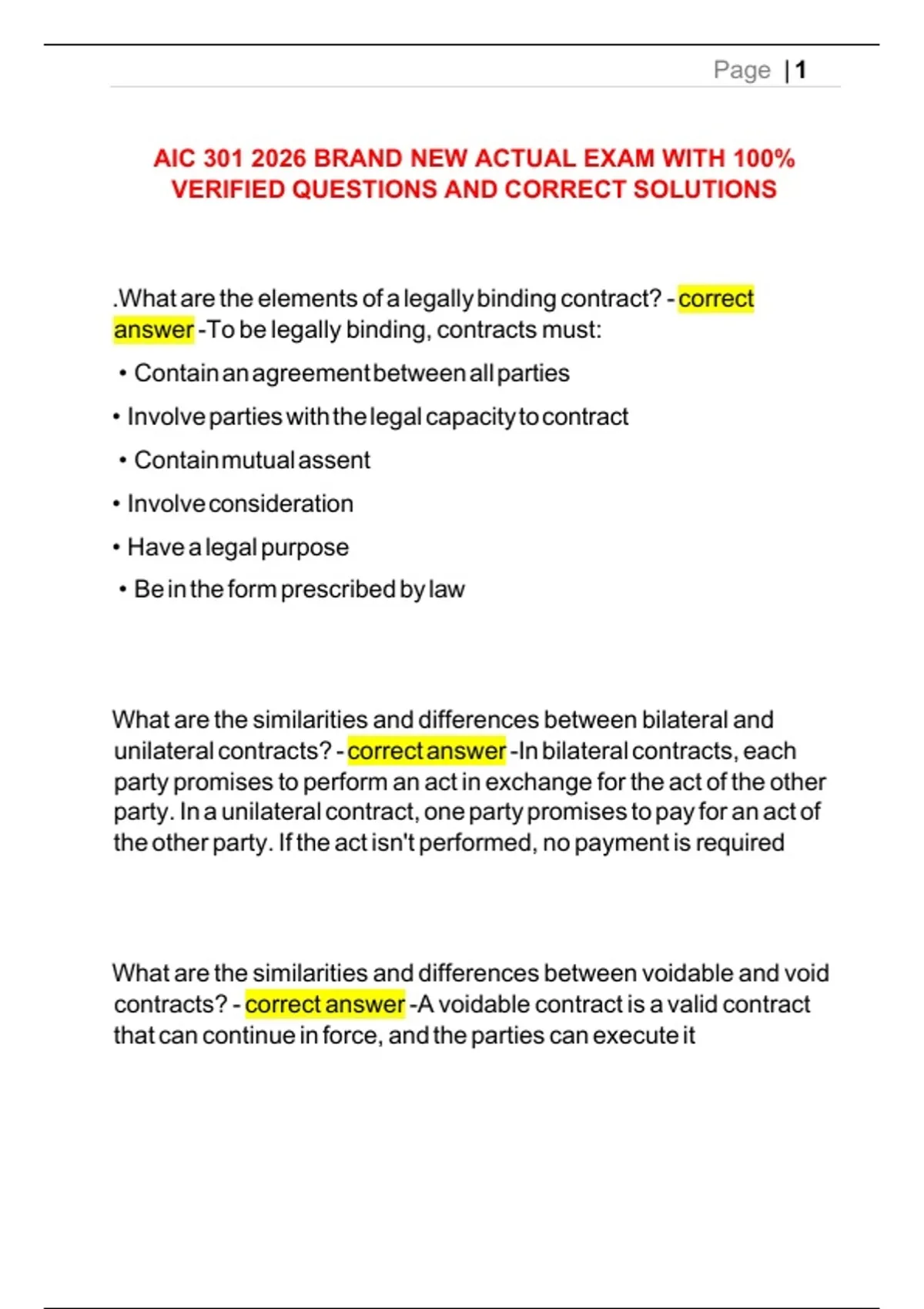 AIC 301 2026 BRAND NEW ACTUAL EXAM WITH 100- VERIFIED QUESTIONS AND CORRECT SOLUTIONS