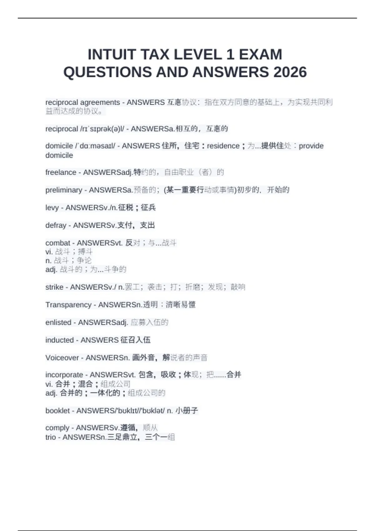 reciprocal agreements - ANSWERS互惠协议:指在双方同意的基础上,为实现共同利益而达成的协议 reciprocal /rɪˈsɪprək(ə)l/ - ANSWERSa.相互的,互惠的 domicile /ˈdɑːməsaɪl/ - ANSWERS住所,住宅:residence;为...提供住处:provide domicile freelance - ANSWERSadj.特约的,自由职业(者)的 preliminary - ANSWERSa.预备的;(某一重要行动或事情)初步的,开始的 levy - ANSWERSv./n.征税;征兵 defray - ANSWERSv.支付,支出 combat - ANSWERSvt. 反对;与...战斗 vi. 战斗;搏斗 n. 战斗;争论 adj. 战斗的;为...斗争的 strike - ANSWERSv./ n.罢工;袭击;打;折磨;发现;敲响 Transparency - ANSWERSn.透明;清晰易懂 enlisted - ANSWERSadj. 应募入伍的