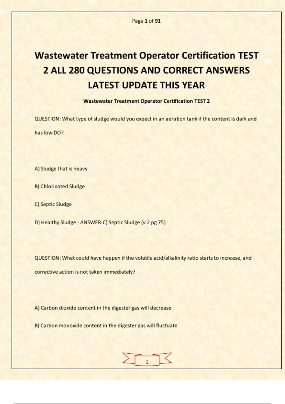Tap on AVAILABLE IN BUNDLE / PACKAGE DEAL to unlock free bonus exams — save more while getting everything you need! You’ll be glad you did! The Wastewater Treatment Operator Certification Test 2 – All 280 Questions and Correct Answers (Latest Update This Year) is a fully updated and comprehensive study resource designed to help candidates thoroughly prepare for the second section of the Wastewater Treatment Operator Certification exams. This guide covers essential topics, including wastewater treatment processes, water quality monitoring, regulatory compliance, chemical handling, system operations, equipment maintenance, troubleshooting, and practical scenario-based problem-solving. Each question is paired with a verified correct answer, allowing candidates to practice across multiple formats and difficulty levels, reinforcing knowledge and boosting exam readiness. Ideal for wastewater treatment operators, environmental professionals, and students preparing for Wastewater Treatment Operator Certification Test 2, this resource ensures thorough review, effective practice, and confident performance on exam day.