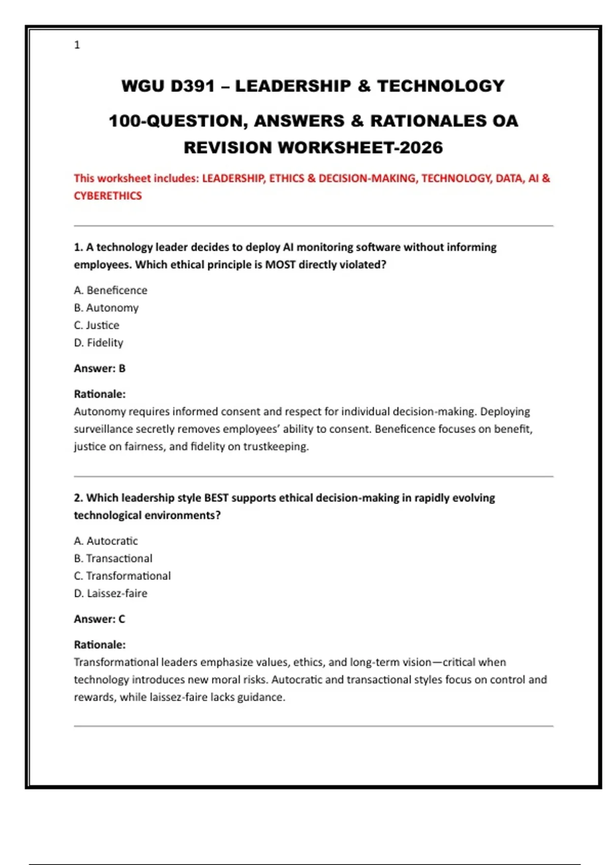 This worksheet includes: LEADERSHIP, ETHICS & DECISION-MAKING, TECHNOLOGY, DATA, AI &