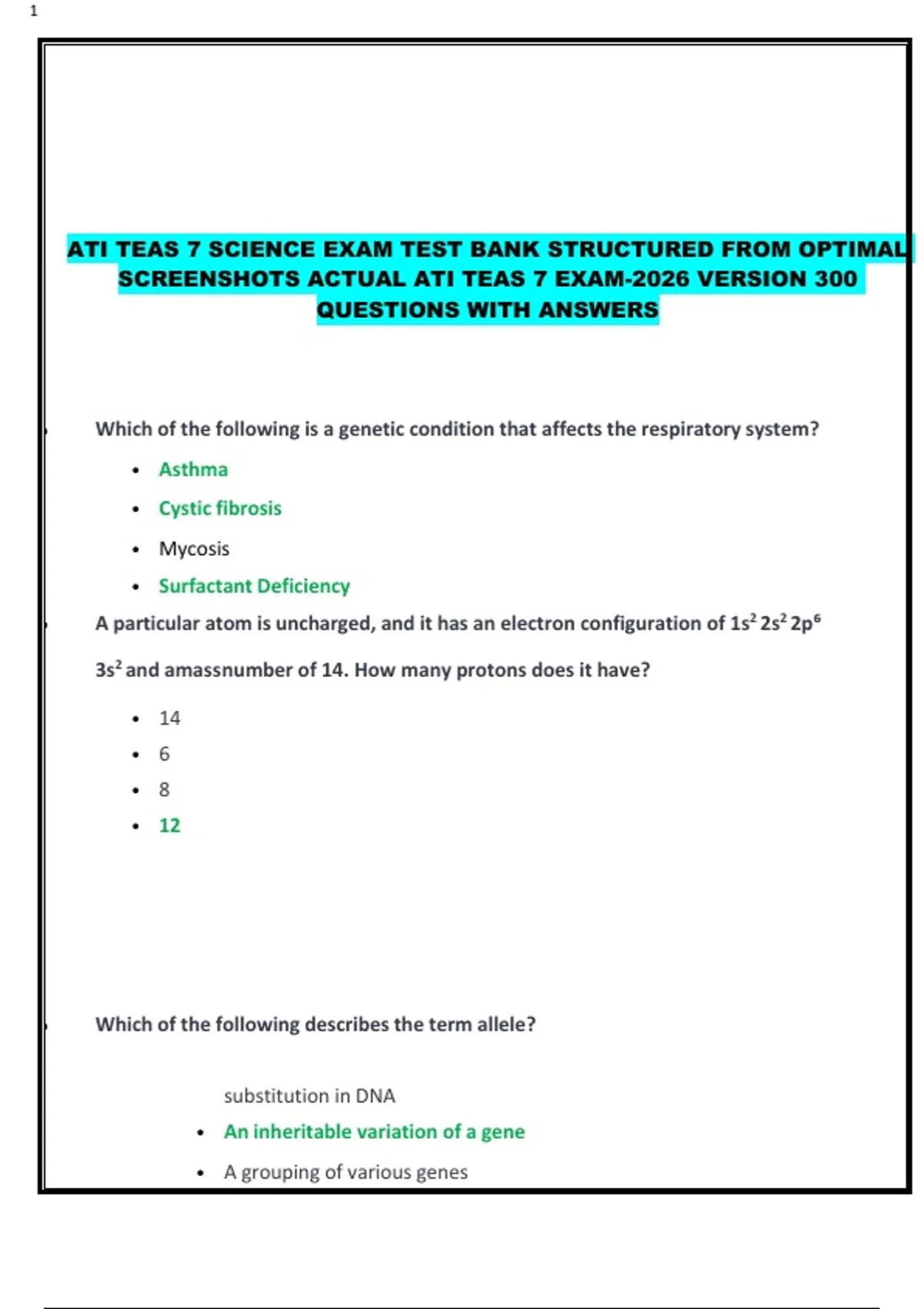 ATI TEAS 7 SCIENCE EXAM TEST BANK STRUCTURED FROM OPTIMAL
