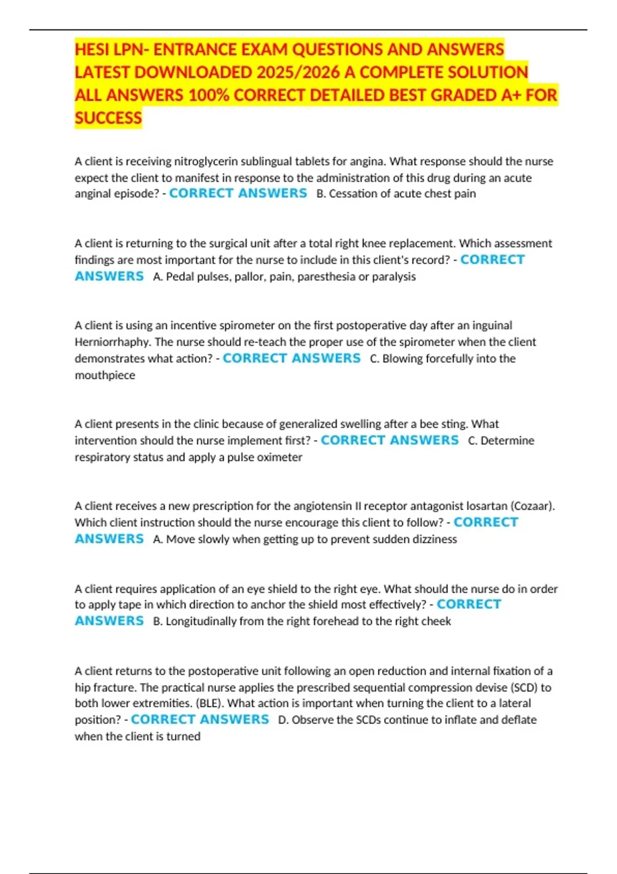 , HESI LPN- ENTRANCE EXAM QUESTIONS AND ANSWERS
