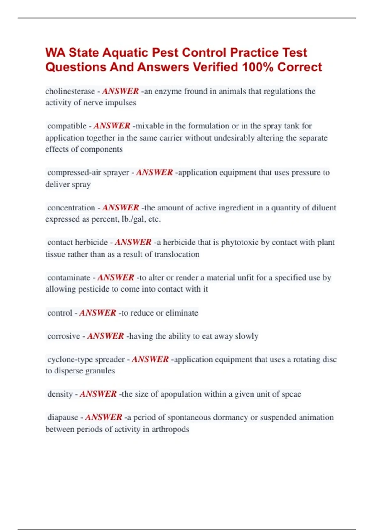 WA State Aquatic Pest Control Practice Test Questions And Answers Verified 100% Correct cholinesterase - ANSWER -an enzyme fround in animals that regulations the activity of nerve impulses compatible - ANSWER -mixable in the formulation or in the spray tank for application together in the same carrier without undesirably altering the separate effects of components compressed-air sprayer - ANSWER -application equipment that uses pressure to deliver spray concentration - ANSWER -the amount of active ingredient in a quantity of diluent expressed as percent, lb./gal, etc. contact herbicide - ANSWER -a herbicide that is phytotoxic by contact with plant tissue rather than as a result of translocation contaminate - ANSWER -to alter or render a material unfit for a specified use by allowing pesticide to come into contact with it control - ANSWER -to reduce or eliminate corrosive - ANSWER -having the ability to eat away slowly cyclone-type spreader - ANSWER -application equipment that uses a rotating disc to disperse granules density - ANSWER -the size of apopulation within a given unit of spcae diapause - ANSWER -a period of spontaneous dormancy or suspended animation between periods of activity in arthropods diluent - ANSWER -any gas, liquid, or solid material used to reduce the concentration of an active ingredient in a formulation disperse - ANSWER -to spread out of scatter or separate and move apart dispersing agent - ANSWER -a material that reduces the cohesive forces between similar particles dissolve - ANSWER -refers to getting solid into solution dormancy - ANSWER -a state of suspended development dose (rate) - ANSWER -the terms are the same; however, rate is preferred. the amount of active ingredient applied to a unit area regardless of percentage of chemical in the carrier ecosystem - ANSWER -a community of life and its environment functioning as a unit in nature emergence - ANSWER -the act of germinating seedlings breaking through the soil or an insect splitting its pupal case emersed plant - ANSWER -a rooted or anchored aquatic plant adapted to grow with most of its leaf-stem tissue above the water surface; does not fall or rise with the water level emulsifiable concentrate - ANSWER -a concentrated pesticide formulation containing organic solvents and adjuvants to produce an emulsion with water encephalitis - ANSWER -a viral diseas transmitted to people or horses by mosquitoes or ticks. causes inflammation of the brain emulsion - ANSWER -the suspension of one liquid as a minute globule in another liquid (for example, oil dispersed in water) erosion - ANSWER -wearing away by wind or water exposure - ANSWER -when pesticides contact skin (dermal), mouth (oral), lungs (inhalation), or eyes exoskeleton - ANSWER -the hard "shell" of arthropods to which their muscles are attached and which serves the same function as the bony skeleton of humans filler - ANSWER -a diluent in powderd form floating plant - ANSWER -a free-floating or anchored aquatic plant adapted to grow with most of its vegetation tissue at or above the water surface; rises and falls with the water level flowable - ANSWER -formulation with active ingredient impregnated on very fine solids suspended in liquid fogger - ANSWER -application equipment that breaks liquid into very fine droplets (.1-50 microns) and blows or drifts them onto the traget area. Also called an aerosol generator formulation - ANSWER -a mixture containing the active ingredient, carrier, diluents, and other additives required to make the product ready for application gpa - ANSWER -gallons per acre gpm - ANSWER -gallons per minute granule, granular - ANSWER -a dry formulation of pesticide in which the active ingredient is impregnated on small particles of carrier, such as clay or ground up corn cobs