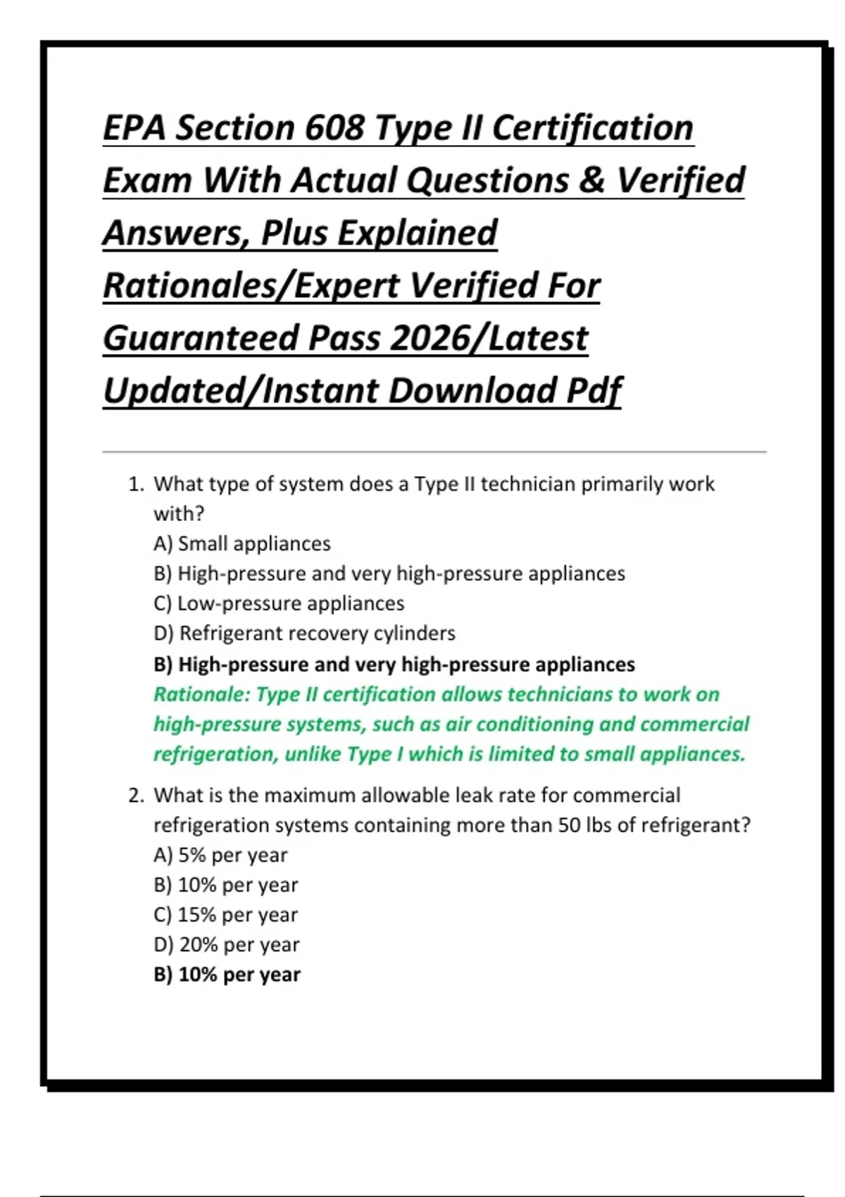 EPA Section 608 Type II Certification Exam With Actual Questions & Verified Answers, Plus Explained Rationales/Expert Verified For Guaranteed Pass 2026/Latest Updated/Instant Download Pdf