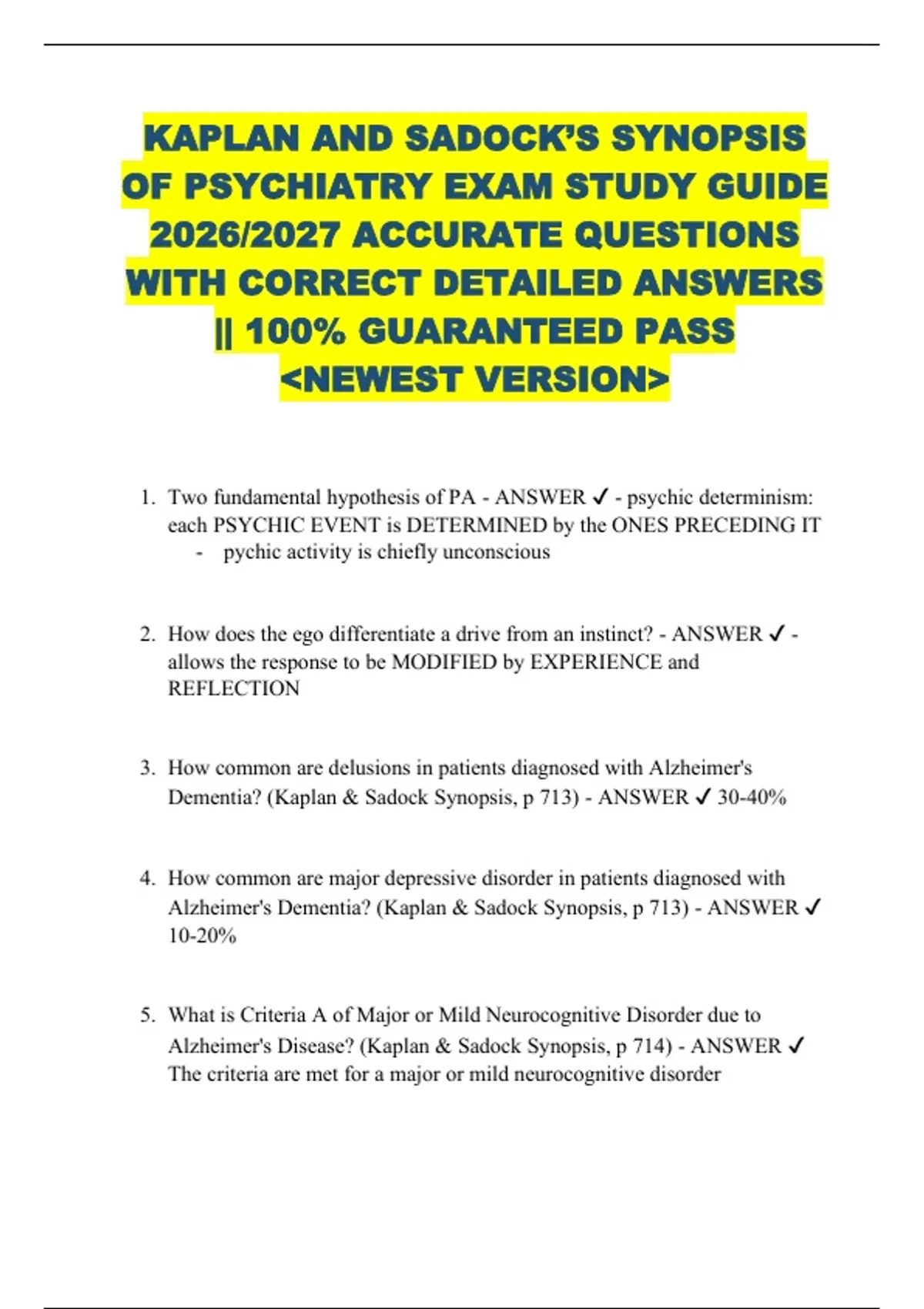 KAPLAN AND SADOCK’S SYNOPSIS OF PSYCHIATRY EXAM STUDY GUIDE 2026/2027 ACCURATE QUESTIONS WITH CORRECT DETAILED ANSWERS || 100% GUARANTEED PASS NEWEST VERSION 1. Two fundamental hypothesis of PA - ANSWER - psychic determinism: each PSYCHIC EVENT is DETERMINED by the ONES PRECEDING IT - pychic activity is chiefly unconscious 2. How does the ego differentiate a drive from an instinct? - ANSWER - allows the response to be MODIFIED by EXPERIENCE and REFLECTION 3. How common are delusions in patients diagnosed with Alzheimer's Dementia? (Kaplan & Sadock Synopsis, p 713) - ANSWER 30-40% 4. How common are major depressive disorder in patients diagnosed with Alzheimer's Dementia? (Kaplan & Sadock Synopsis, p 713) - ANSWER 10-20% 5. What is Criteria A of Major or Mild Neurocognitive Disorder due to Alzheimer's Disease? (Kaplan & Sadock Synopsis, p 714) - ANSWER The criteria are met for a major or mild neurocognitive disorder 6. What is Criteria B of Major or Mild Neurocognitive Disorder due to Alzheimer's Disease? (Kaplan & Sadock Synopsis, p 714) - ANSWER There is insidious onset and gradual progression of impairment in one or more cognitive domains (for mild) and at least two or more (for major) 7. Seizures are more common which subtype of Dementia? (Kaplan & Sadock Synopsis, p 714) - ANSWER Vascular Dementia 8. Psueudobulbar palsy. Dysarthria and dysphasia are mostly found in this subtype of Dementia (Kaplan & Sadock Synopsis, p 714) - ANSWER Vascular Dementia 9. What is the most frequent psychiatric disorder that occurs with pathological fire setting? - ANSWER Conduct disorder 10. Children who endure sexual or physical abuse often display what behaviors themselves? - ANSWER Sadistic and aggressive behaviors 11. Physical indications of sexual abuse in children? - ANSWER STDs, pain, irritation, and itching of the genitalia and the urinary tract, and discomfort while sitting and walking 12. Marked growth retardation and delayed epiphyseal malnutrition accompany a disturbed relationship between the parent and the child, along with bizarre social and eating behaviors in the child? - ANSWER Psychosocial dwarfism 13. Half of children with psychosocial dwarfism have a decreased amount of what hormone? - ANSWER Growth hormone 14. Whenever neglect is suspected what must the doctor do? - ANSWER It must be reported to the local child protective service agency 15. Anorexia nervosa is characterized as? - ANSWER Refusal to maintain body weight, leading to a weight at least 15 percent below the expected weight, by a distorted body image, by a persistent fear of becoming fat, and by the absence of at least three menstrual cycles 16. Anorexia nervosa becomes serious when weight loss approaches what level? - ANSWER 30 percent of body weight or when metabolic distances become severe 17. What are the medical complications associated with starvation? - ANSWER Electrolyte imbalances, cardiac arrhythmias, and hormonal changes 18. What drug can be used to treat asymptomatic AIDS patients? - ANSWER Azidothymidine (AZT) 19. HIV infection in children's brains results in? - ANSWER Encephalitis, decreased brain development, and impaired memory, concentration, and attention span 20. School refusal is generally associated with? - ANSWER Separation anxiety 21. School refusal can also occur in children with? - ANSWER School phobia 22. When a child's anxiety is not diminished by behavioral methods alone in relations to school refusal, what drug can be used? - ANSWER Tricyclic antidepressant, imipramine (Tofranil) 23. Form of child abuse in which a parent repeatedly fabricates or actually inflicts injury or illness in a child for whom medical intervention is then sought, often in an emergency setting? - ANSWER Munchausen syndrome 24. Dissocative disorders most commonly occur in children who have been subjected to? - ANSWER Severe and repetitive physical, sexual, and emotional abuse 25. What techniques have been used to treat children with dissociative disorders? - ANSWER Play techniques and hypnosis 26. Assault can be viewed in the context of what two variables? - ANSWER Who is being assaulted and where the assault occurs 27. The prevalence of the different types of assault are reported by what two different data collection systems? - ANSWER The Federal Bureau of Investigation's Uniform Crime Report (UCR) and The Bureau of Justice Statistics' National Crime Victimization Survey (NCVS) 28. Murder and non-negligent manslaughter, forcible rape, robbery, and aggravated assault? - ANSWER Violent crime