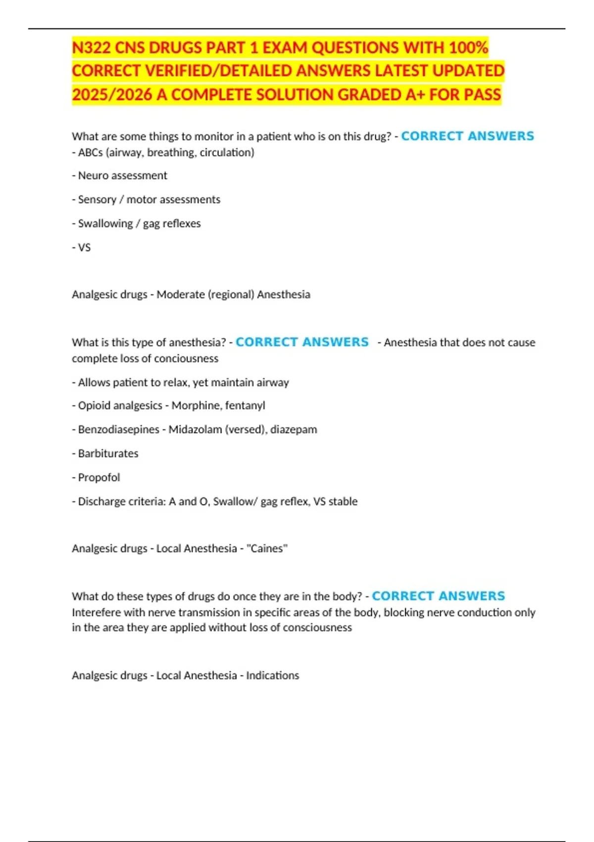 N322 CNS DRUGS PART 1 EXAM QUESTIONS WITH 100%