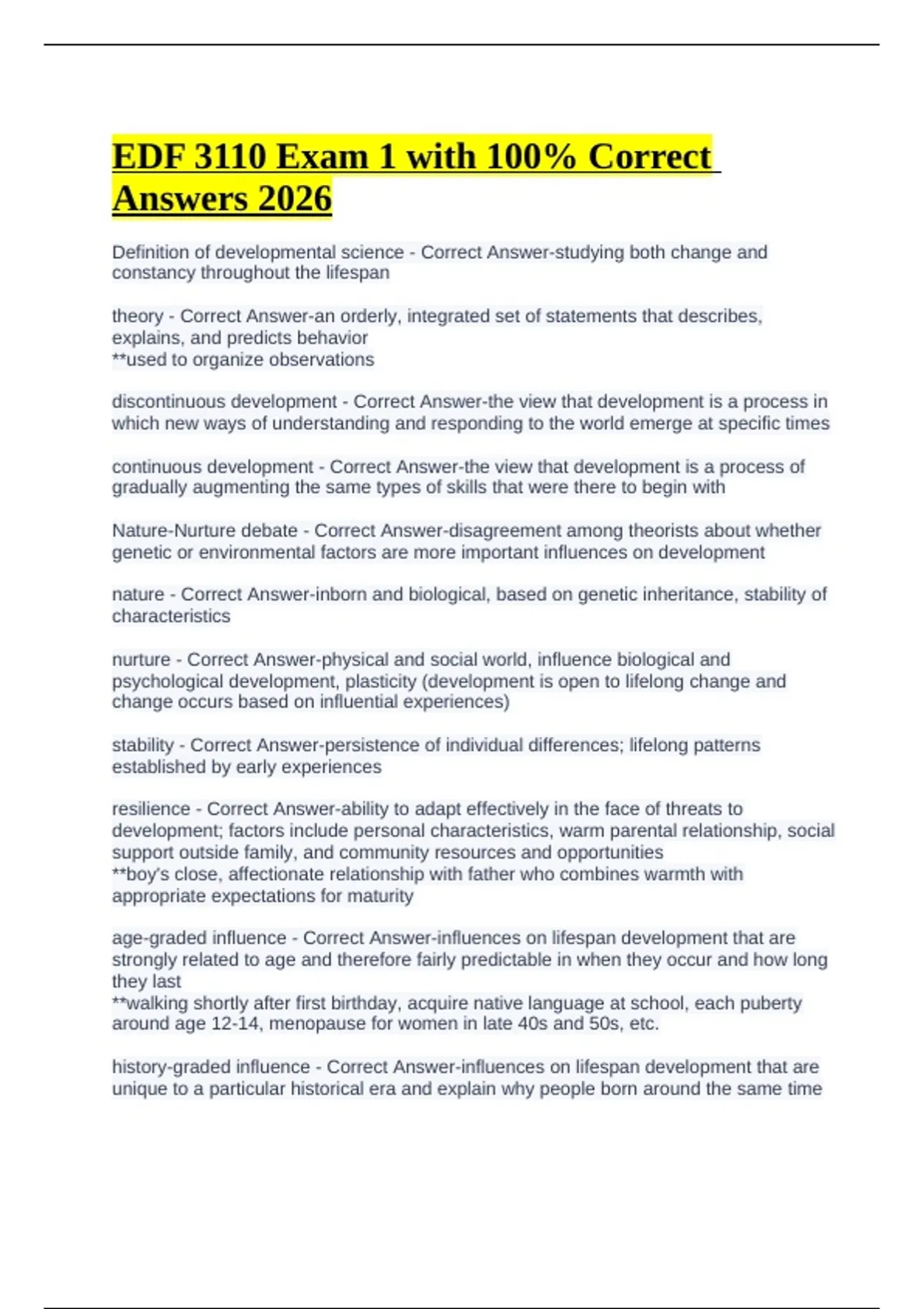 EDF 3110 Exam 1 with 100% Correct Answers 2026 Definition of developmental science - Correct Answer-studying both change and constancy throughout the lifespan theory - Correct Answer-an orderly, integrated set of statements that describes, explains, and predicts behavior **used to organize observations discontinuous development - Correct Answer-the view that development is a process in which new ways of understanding and responding to the world emerge at specific times continuous development - Correct Answer-the view that development is a process of gradually augmenting the same types of skills that were there to begin with Nature-Nurture debate - Correct Answer-disagreement among theorists about whether genetic or environmental factors are more important influences on development nature - Correct Answer-inborn and biological, based on genetic inheritance, stability of characteristics nurture - Correct Answer-physical and social world, influence biological and psychological development, plasticity (development is open to lifelong change and change occurs based on influential experiences) stability - Correct Answer-persistence of individual differences; lifelong patterns established by early experiences resilience - Correct Answer-ability to adapt effectively in the face of threats to development; factors include personal characteristics, warm parental relationship, social support outside family, and community resources and opportunities **boy's close, affectionate relationship with father who combines warmth with appropriate expectations for maturity age-graded influence - Correct Answer-influences on lifespan development that are strongly related to age and therefore fairly predictable in when they occur and how long they last **walking shortly after first birthday, acquire native language at school, each puberty around age 12-14, menopause for women in late 40s and 50s, etc. history-graded influence - Correct Answer-influences on lifespan development that are unique to a particular historical era and explain why people born around the same time (called a cohort) tend to be alike in ways that set them apart from people born at other times **baby boomers nonnormative influence - Correct Answer-influences on lifespan development that are irregular, in that they happen to just one or a few individuals and do not follow a predictable timetable **piano lessons during childhood with an inspiring teacher, battle with cancer, etc. lifespan perspective - Correct Answer-a dynamic systems approach to development that assumes development is lifelong, multidimensional and multidirectional, highly plastic, and affected by multiple interacting forces psychoanalytic perspective (Freud & Erikson) - Correct Answer-emphasis on individual's unique life history; conflicts between biological drives and social expectations; interprets human development in terms of motives and drives (drives are often unconscious and influence every aspect of a person's life; stages of development occur in sequence; first theory to consider parent/child relationship; how parents manage child's innate impulses and drives Freud's three parts of the personality - Correct Answer-Id: largest portion of the mind; unconscious, present at birth; source of biological needs/desires Ego: conscious, rational part of personality; emerges in early infancy, redirects id impulses in acceptable ways; **mediates between id and superego Superego: the conscience; develops from ages 3 to 6 through interactions with caregivers **when the id impulse to grab an attractive toy from a playmate confronts the superego's warning that such behavior is wrong, the ego must mediate between these two forces behaviorism - Correct Answer-development involves an increase in learned behaviors and may vary person to person classical conditioning - Correct Answer-Pavlov; the creation of a new involuntary response to a stimulus that did not normally produce that response **Office episode operant conditioning - Correct Answer-B.F. Skinner; increasing the rate of an already occurring response through reinforcement **Big Bang Theory episode