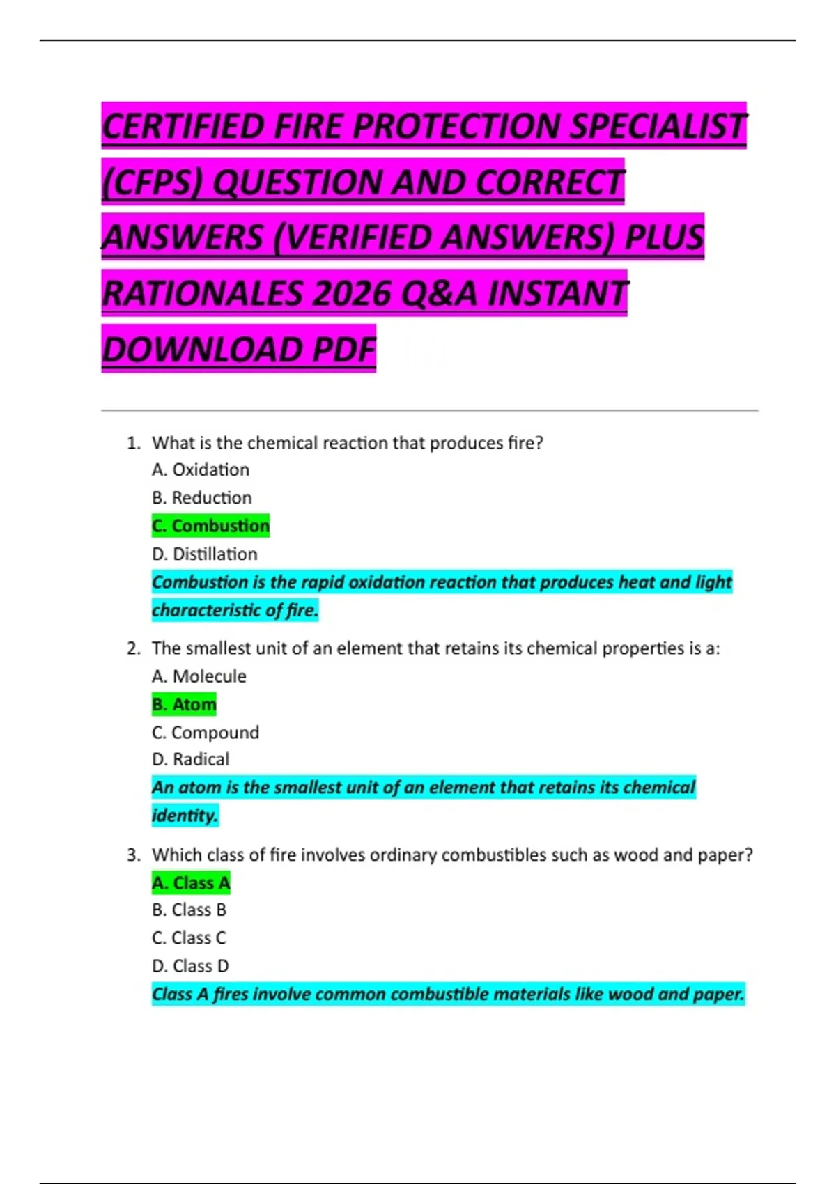 CERTIFIED FIRE PROTECTION SPECIALIST (CFPS) QUESTION AND CORRECT ANSWERS (VERIFIED ANSWERS) PLUS RATIONALES 2026 Q&A INSTANT DOWNLOAD PDF