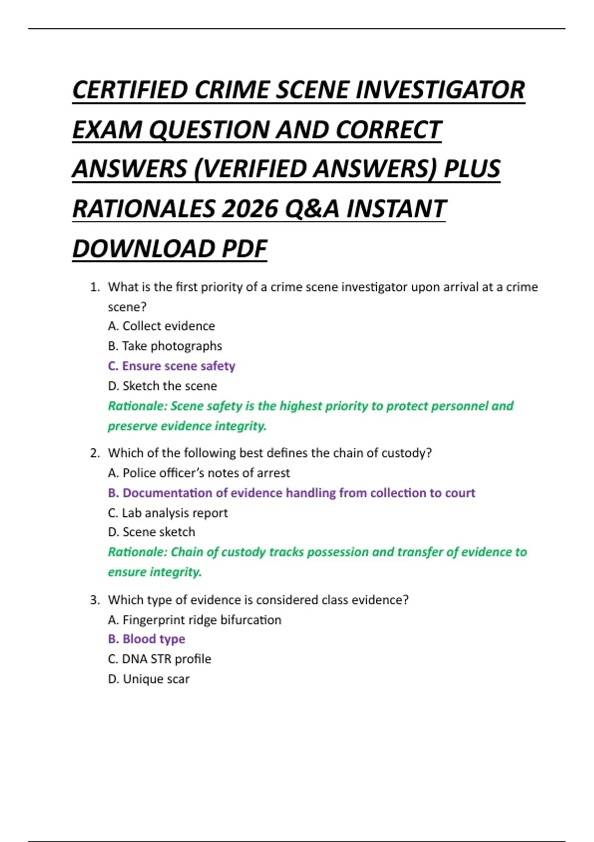 CERTIFIED CRIME SCENE INVESTIGATOR EXAM QUESTION AND CORRECT ANSWERS (VERIFIED ANSWERS) PLUS RATIONALES 2026 Q&A INSTANT DOWNLOAD PDF