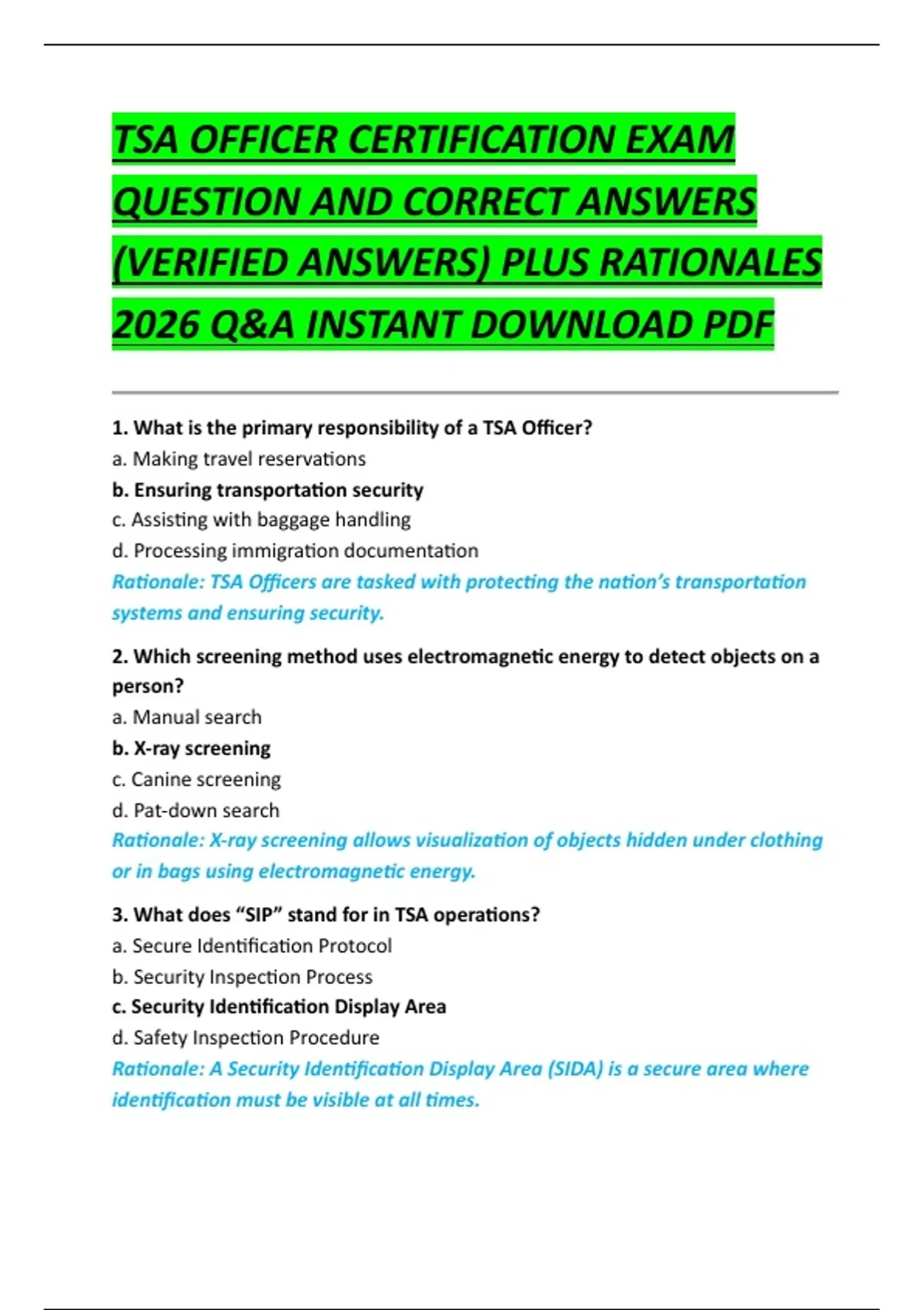 TSA OFFICER CERTIFICATION EXAM QUESTION AND CORRECT ANSWERS (VERIFIED ANSWERS) PLUS RATIONALES 2026 Q&A INSTANT DOWNLOAD PDF