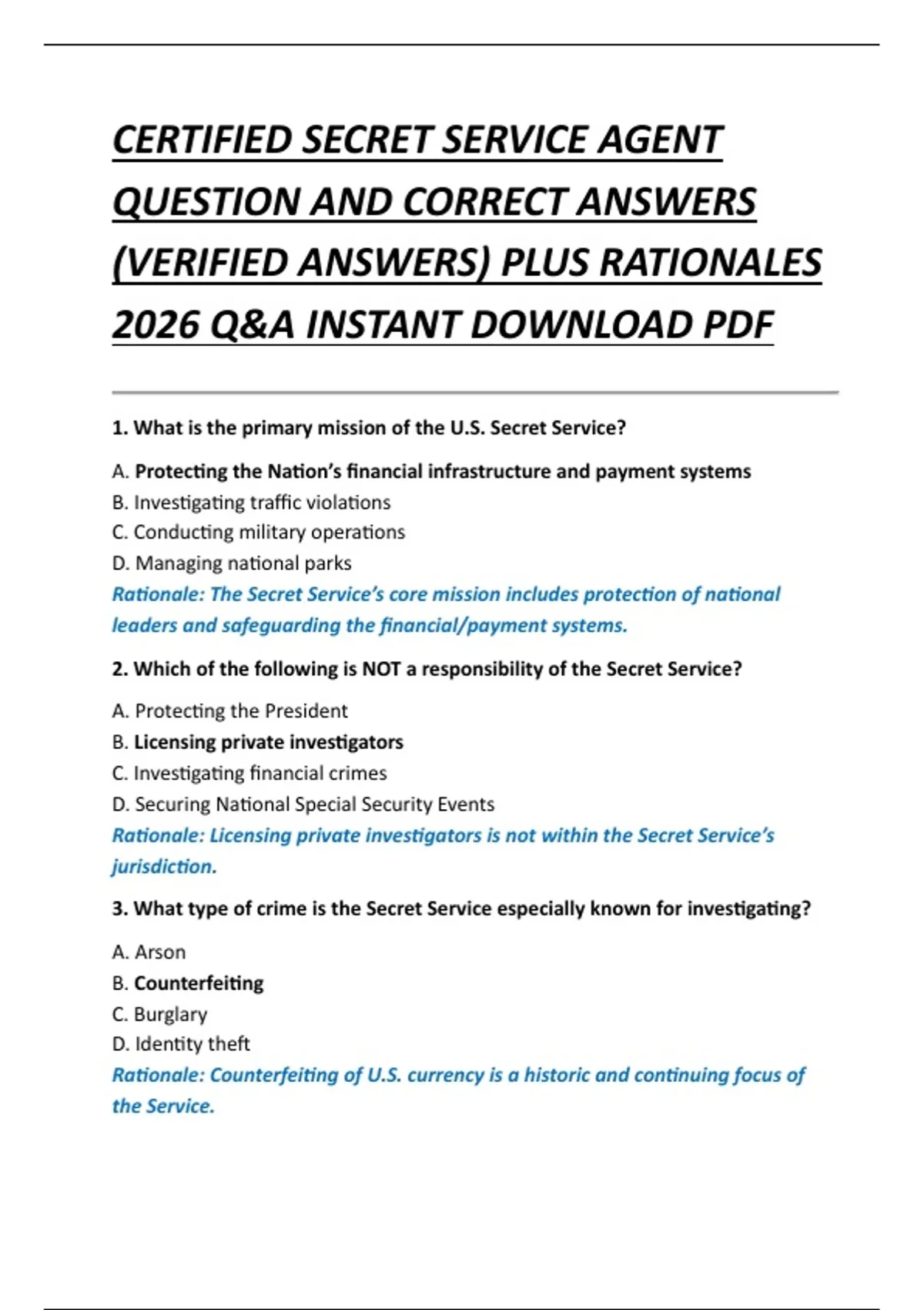 CERTIFIED SECRET SERVICE AGENT QUESTION AND CORRECT ANSWERS (VERIFIED ANSWERS) PLUS RATIONALES 2026 Q&A INSTANT DOWNLOAD PDF