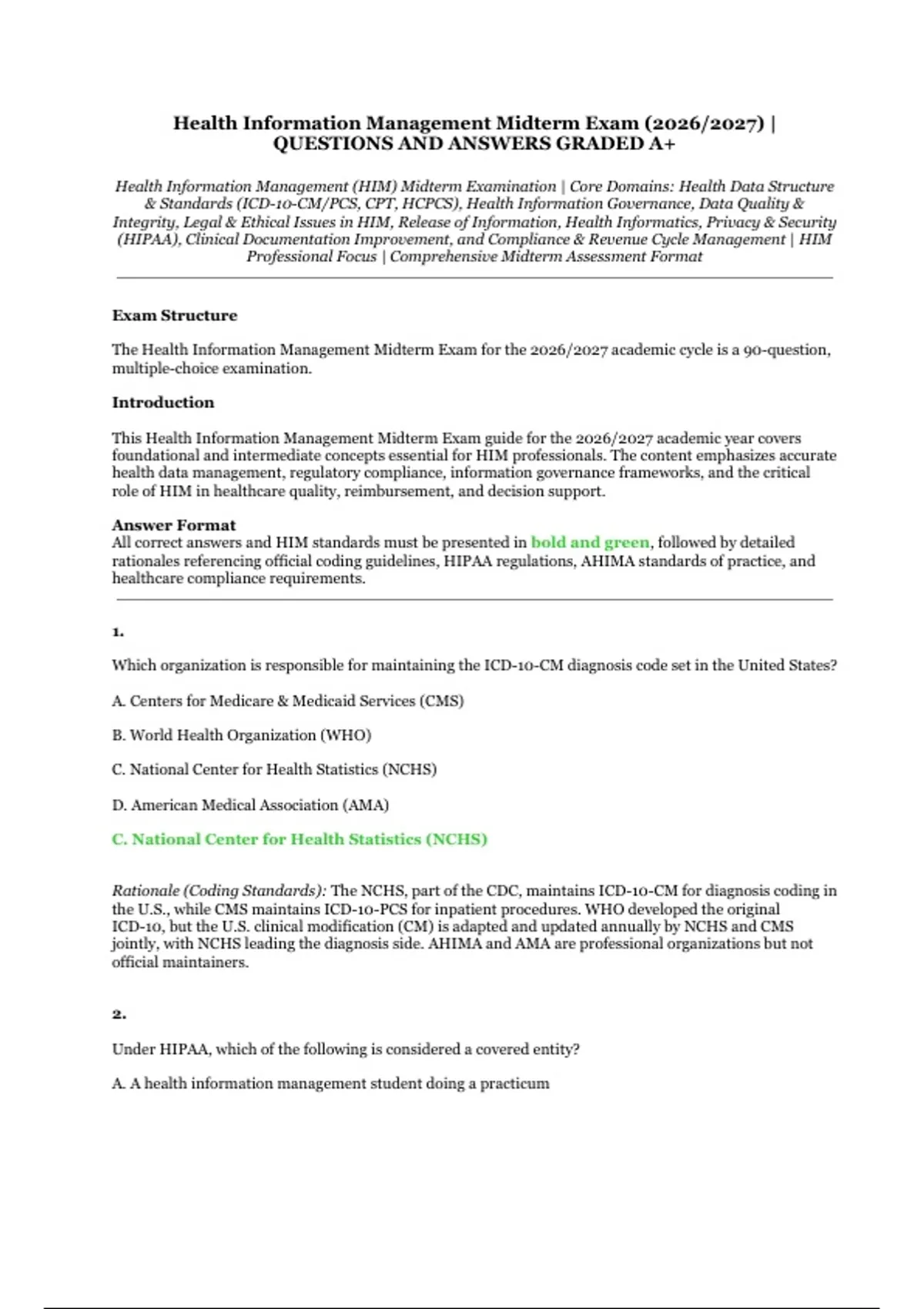 This document contains Health Information Management (HIM) midterm exam questions with accurate answers, designed for students and professionals in HIM programs. It covers essential domains including health data structure and coding standards (ICD-10-CM/PCS, CPT, HCPCS), health information governance, data quality and integrity, legal and ethical issues, release of information, health informatics, privacy and security under HIPAA, clinical documentation improvement, and compliance and revenue cycle management. The material follows a comprehensive midterm assessment format for the 2026/2027 academic year.