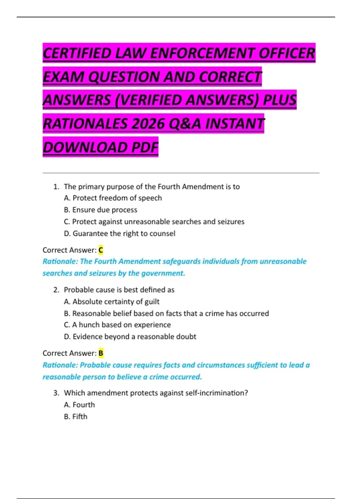 CERTIFIED LAW ENFORCEMENT OFFICER EXAM QUESTION AND CORRECT ANSWERS (VERIFIED ANSWERS) PLUS RATIONALES 2026 Q&A INSTANT DOWNLOAD PDF