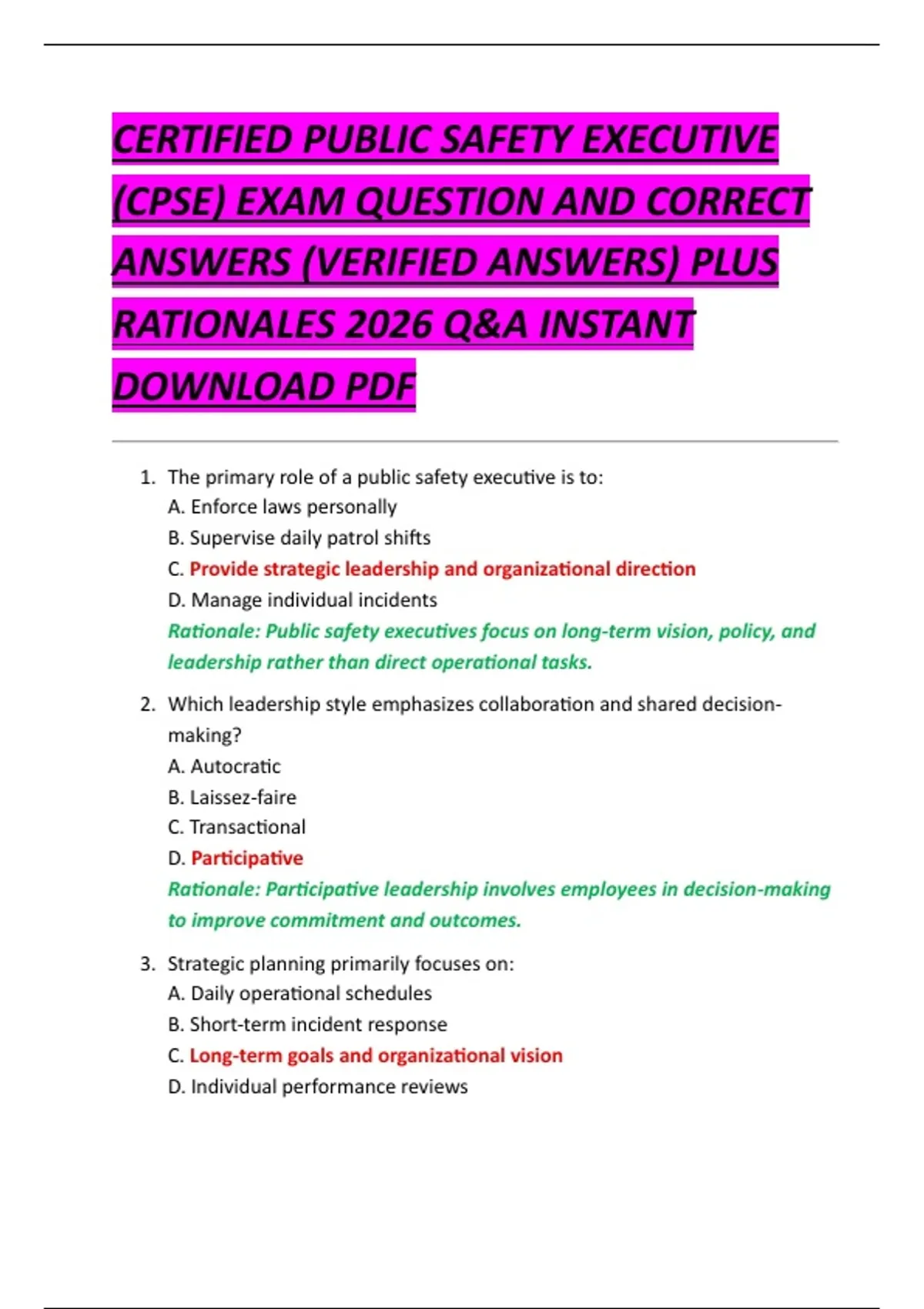 CERTIFIED PUBLIC SAFETY EXECUTIVE (CPSE) EXAM QUESTION AND CORRECT ANSWERS (VERIFIED ANSWERS) PLUS RATIONALES 2026 Q&A INSTANT DOWNLOAD PDF