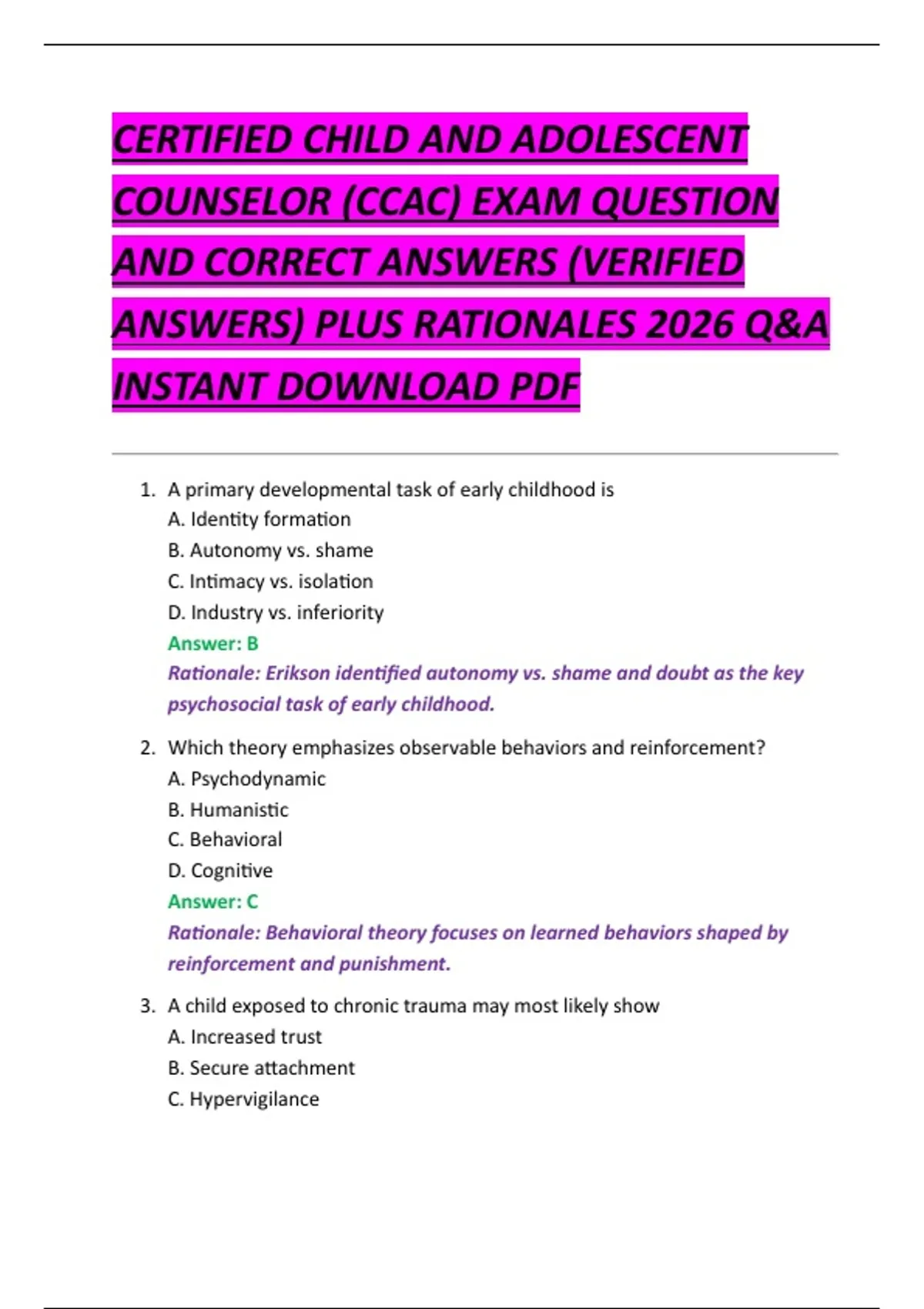 CERTIFIED CHILD AND ADOLESCENT COUNSELOR (CCAC) EXAM QUESTION AND CORRECT ANSWERS (VERIFIED ANSWERS) PLUS RATIONALES 2026 Q&A INSTANT DOWNLOAD PDF