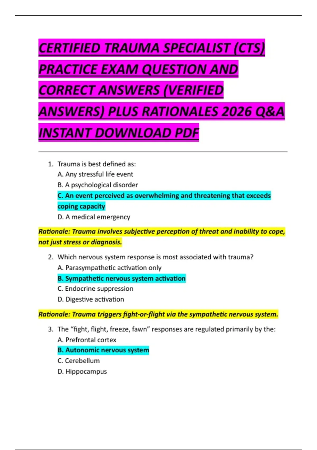 CERTIFIED TRAUMA SPECIALIST (CTS) PRACTICE EXAM QUESTION AND CORRECT ANSWERS (VERIFIED ANSWERS) PLUS RATIONALES 2026 Q&A INSTANT DOWNLOAD PDF