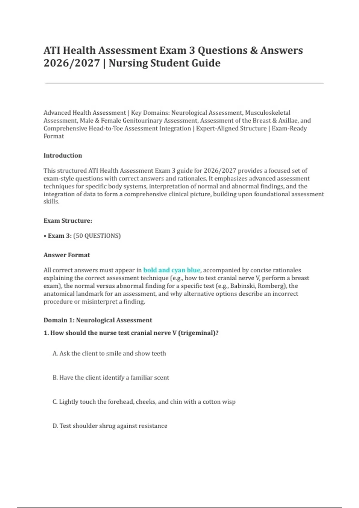 This structured ATI Health Assessment Exam 3 guide for 2026/2027 provides a focused set of