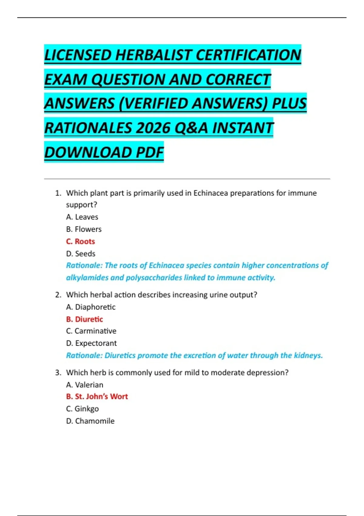 LICENSED HERBALIST CERTIFICATION EXAM QUESTION AND CORRECT ANSWERS (VERIFIED ANSWERS) PLUS RATIONALES 2026 Q&A INSTANT DOWNLOAD PDF