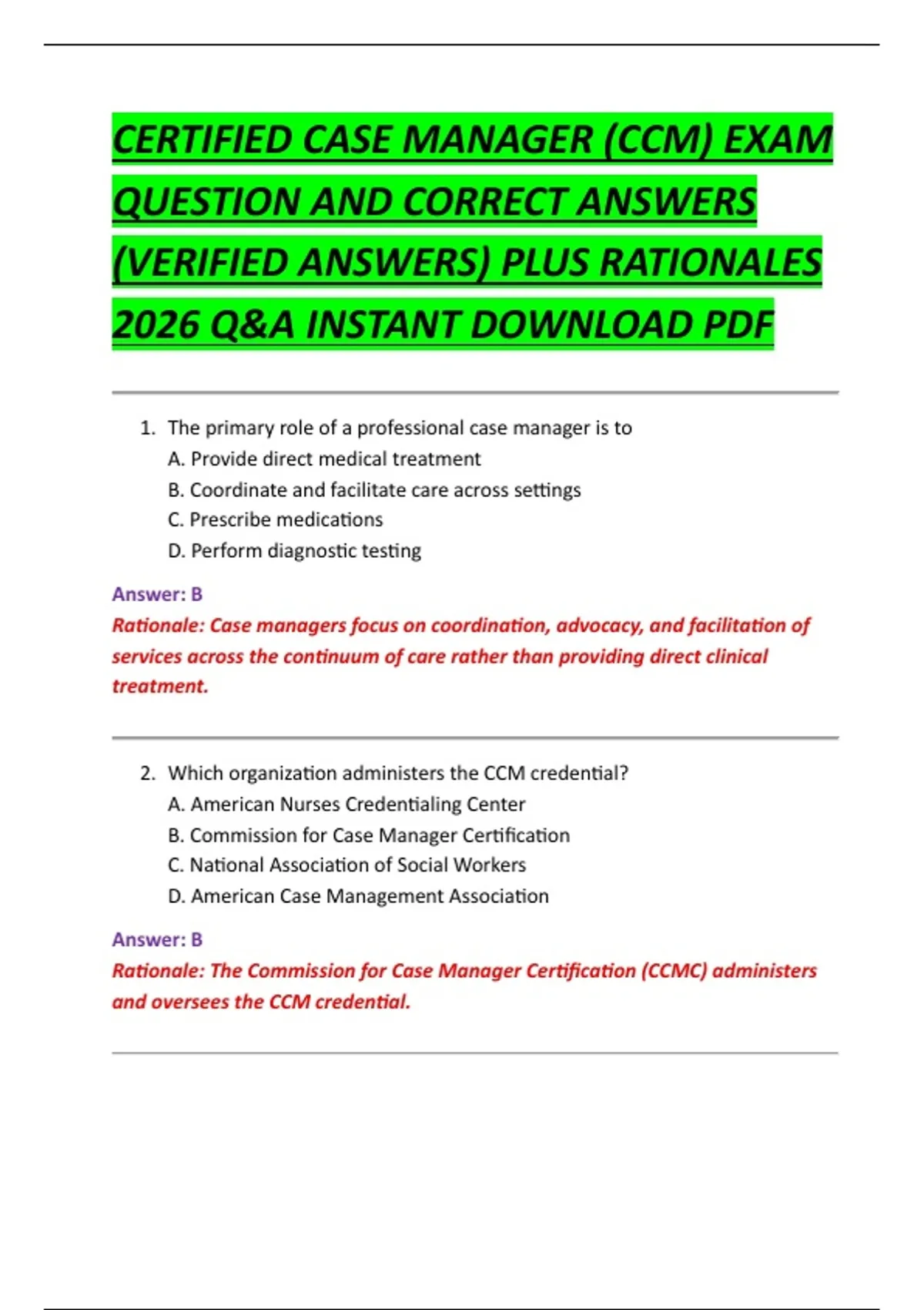 CERTIFIED CASE MANAGER (CCM) EXAM QUESTION AND CORRECT ANSWERS (VERIFIED ANSWERS) PLUS RATIONALES 2026 Q&A INSTANT DOWNLOAD PDF