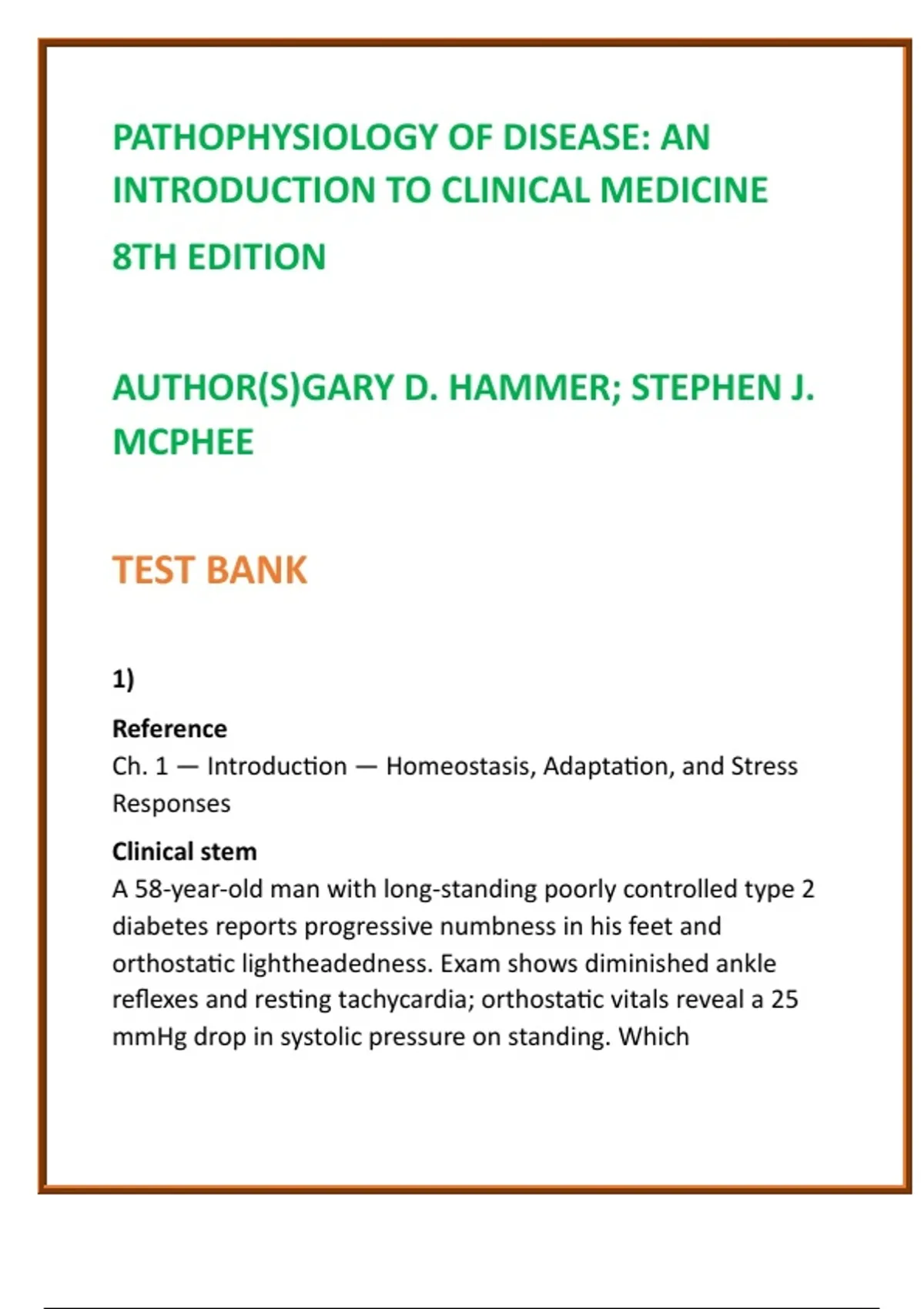 Pathophysiology of Disease Test Bank (8th Ed) | Hammer & McPhee | Case-Based Clinical MCQs for Exam Prep Description: Master clinical pathophysiology with a comprehensive, exam-focused test bank built directly from Pathophysiology of Disease: An Introduction to Clinical Medicine, 8th Edition by Gary D. Hammer and Stephen J. McPhee—the gold-standard text for mechanism-based disease understanding. This digital test bank delivers full textbook coverage across every chapter and organ system, with 20 clinically oriented multiple-choice questions per chapter. Each item is case-based and designed to strengthen diagnostic reasoning by linking molecular, cellular, and systemic mechanisms to real-world clinical presentations. Detailed, evidence-based rationales explain not only why the correct answer is right, but why competing options are wrong—reinforcing high-yield concepts and reducing test-day uncertainty. Built for efficiency and depth, this resource saves hours of review time while improving retention, clinical insight, and exam performance. Whether you are preparing for course exams, cumulative finals, or clinical reasoning assessments, this test bank supports confident decision-making grounded in pathophysiology—not rote memorization. Ideal for courses and programs using Hammer & McPhee, including: • Pathophysiology and Clinical Medicine • Internal Medicine Foundations • Medical-Surgical Pathophysiology • Advanced Nursing Pathophysiology (BSN, MSN, DNP) • Physician Assistant (PA) didactic coursework What’s included: • Full-chapter coverage of the 8th Edition • 20 high-quality MCQs per chapter • Detailed, mechanism-driven rationales • Case-based, clinically realistic scenarios • Designed for exam prep and clinical application A must-have study guide for serious learners in medical, PA, and nursing education. Keywords: pathophysiology test bank Pathophysiology of Disease 8th Edition Hammer McPhee test bank clinical pathophysiology questions medical pathophysiology study guide case-based pathophysiology MCQs pathophysiology exam prep PA nursing pathophysiology questions Hashtags: #PathophysiologyTestBank #HammerAndMcPhee #ClinicalPathophysiology #MedicalEducation #NursingPathophysiology #PAStudent #CaseBasedMCQs #ExamPrep #PathophysiologyStudyGuide #ClinicalReasoning