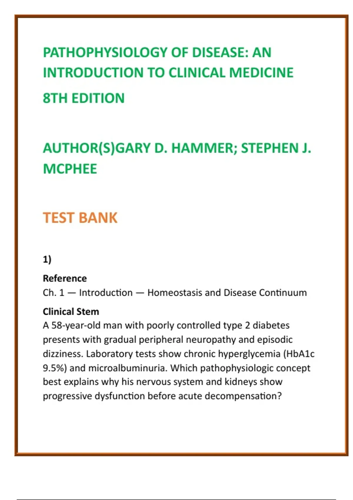 Pathophysiology of Disease Test Bank (8th Ed) | Hammer & McPhee | Case-Based Clinical Pathophysiology MCQs Description: Master disease mechanisms and clinical reasoning with this comprehensive digital test bank built directly from Pathophysiology of Disease: An Introduction to Clinical Medicine, 8th Edition by Hammer & McPhee—the gold standard in clinical pathophysiology education. This exam-ready resource provides FULL textbook coverage across ALL chapters and organ systems, with 20 clinically oriented MCQs per chapter designed to mirror real exam and bedside reasoning. Each question is grounded in pathogenesis, molecular and cellular mechanisms, and systemic consequences, pushing learners beyond memorization into true clinical understanding. Every MCQ includes a clearly identified correct answer with detailed, evidence-based rationales, explaining why an option is correct and why others are not. Clinical case vignettes integrate signs and symptoms, diagnostic interpretation, and disease progression, reinforcing the essential link between basic science and patient care. This test bank is ideal for students and educators seeking a time-efficient, high-yield study guide that builds confidence for exams while strengthening real-world diagnostic thinking. It is perfectly aligned with curricula that rely on Hammer & McPhee, including: Pathophysiology Clinical Medicine & Internal Medicine Foundations Medical-Surgical Pathophysiology Advanced Nursing Pathophysiology (BSN, MSN, DNP) Physician Assistant (PA) didactic coursework Key Features: Full-chapter coverage of Pathophysiology of Disease, 8th Edition 20 high-quality, case-based MCQs per chapter Detailed rationales grounded in disease mechanisms Integration of molecular, cellular, and systemic pathology Designed for exams, coursework mastery, and clinical reasoning Build deeper understanding. Diagnose with confidence. Prepare smarter—not longer. Keywords: pathophysiology of disease test bank Hammer and McPhee pathophysiology clinical pathophysiology questions medical pathophysiology study guide case based pathophysiology MCQs pathophysiology exam prep PA pathophysiology test bank advanced nursing pathophysiology questions Hashtags: #PathophysiologyTestBank #HammerMcPhee #ClinicalPathophysiology #MedicalEducation #PathophysiologyExamPrep #CaseBasedMCQs #PAStudentResources #AdvancedNursingPathophysiology #MedSchoolStudy #ClinicalReasoning