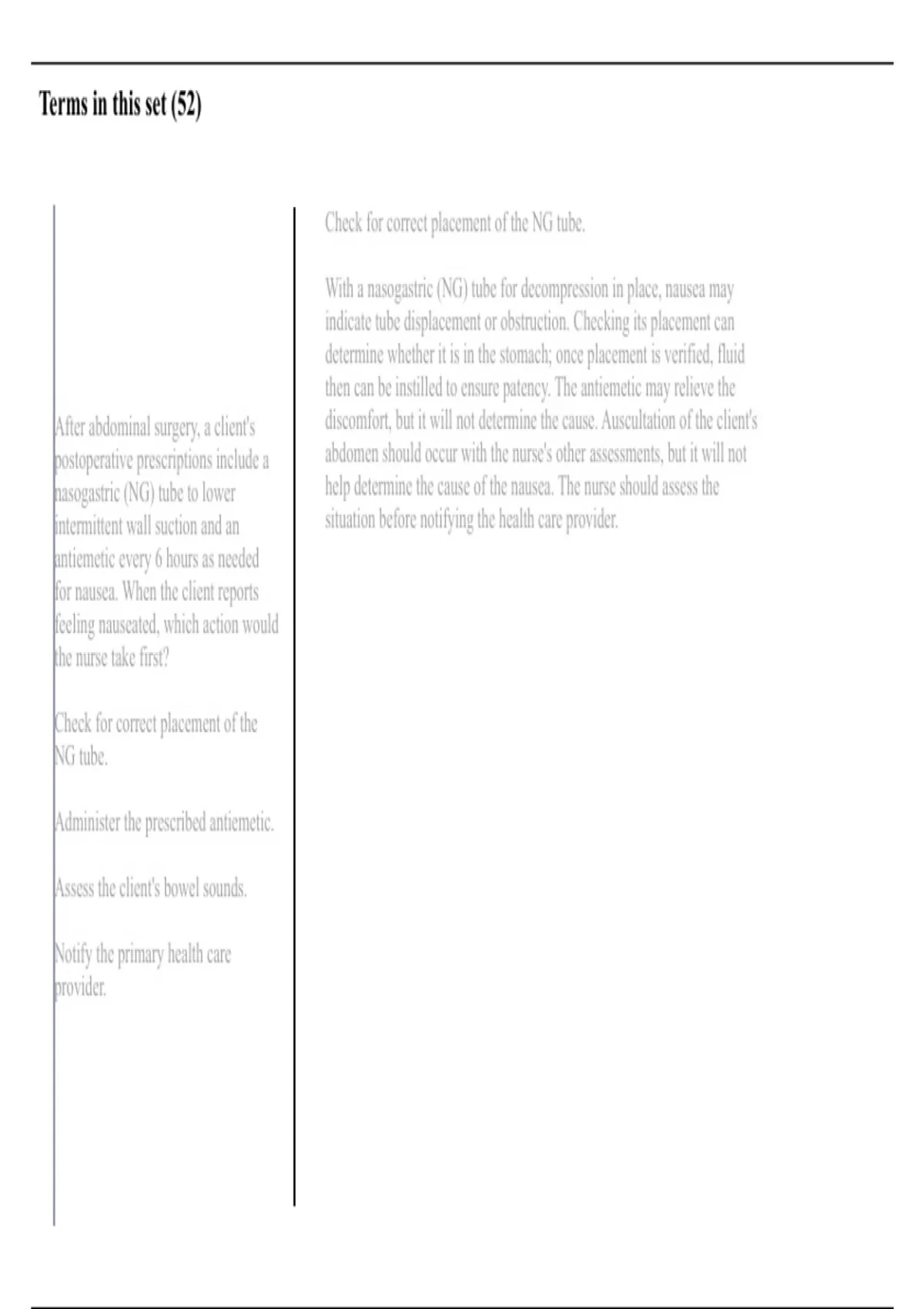nasogastric (NG) tube to lower help determine the cause of the nausea. The nurse should assess the