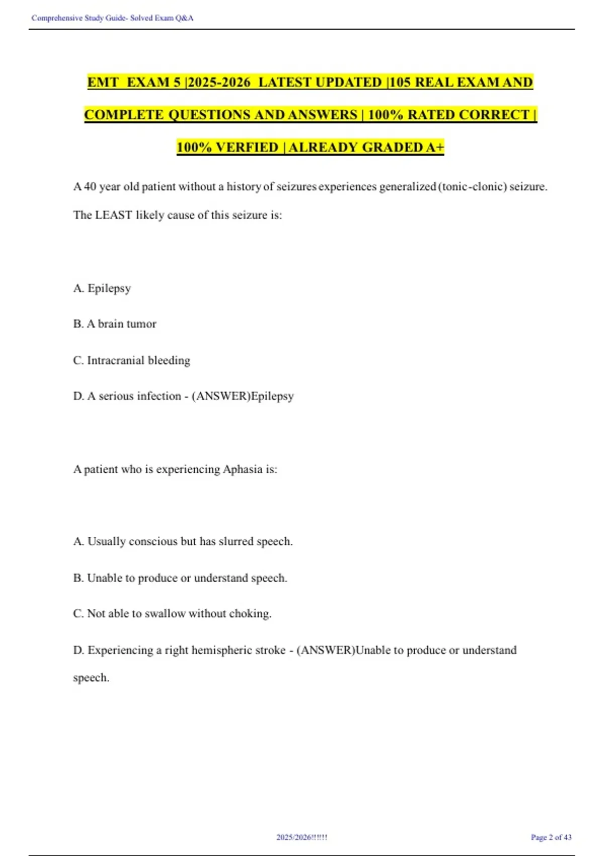 EMT Exam 5 2025/ 2026 Latest Updated 105 Real Exam Questions and Answers Test Bank Study Guide Practice Questions Answer Key with Solution 100% Rated Correct 100% Verified Already Graded Edition