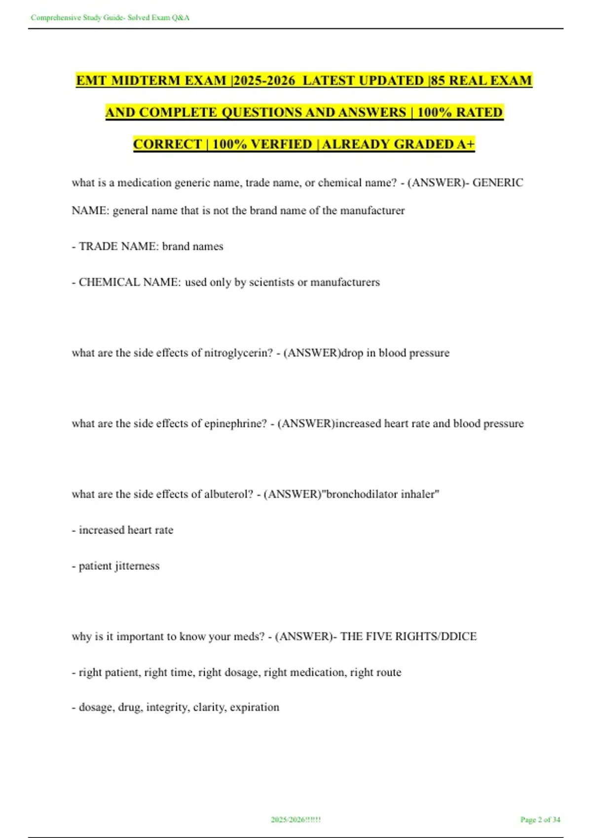 Prepare for the EMT Midterm Exam 2025–2026 with this complete study guide. Includes 85 real exam questions, fully verified solutions, 100% correct answers, and detailed graded explanations for effective midterm preparation.