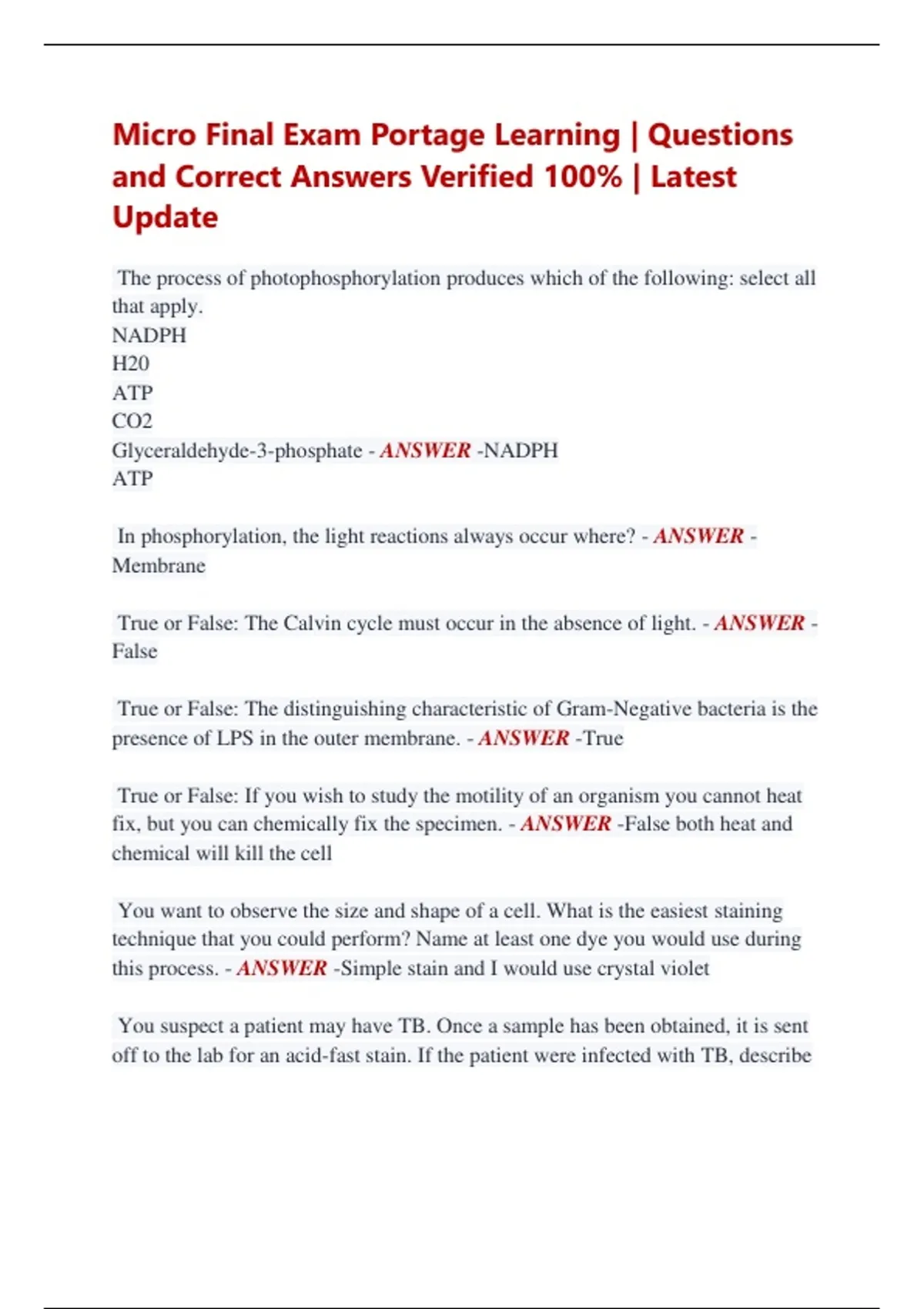 Micro Final Exam Portage Learning | Questions and Correct Answers Verified 100% | Latest Update The process of photophosphorylation produces which of the following: select all that apply. NADPH H20 ATP CO2 Glyceraldehyde-3-phosphate - ANSWER -NADPH ATP In phosphorylation, the light reactions always occur where? - ANSWER Membrane True or False: The Calvin cycle must occur in the absence of light. - ANSWER False True or False: The distinguishing characteristic of Gram-Negative bacteria is the presence of LPS in the outer membrane. - ANSWER -True True or False: If you wish to study the motility of an organism you cannot heat fix, but you can chemically fix the specimen. - ANSWER -False both heat and chemical will kill the cell You want to observe the size and shape of a cell. What is the easiest staining technique that you could perform? Name at least one dye you would use during this process. - ANSWER -Simple stain and I would use crystal violet You suspect a patient may have TB. Once a sample has been obtained, it is sent off to the lab for an acid-fast stain. If the patient were infected with TB, describe what you would expect to see on the stained slide. - ANSWER -Red Cells on a blue background True or False: A Giemsa stain can be used to determine the presence of pathogenic bacteria. - ANSWER -True Identify what type of electron microscope was used to capture the following image and explain your choice (A). - ANSWER -Transmission Electron Microscope (TEM) This shows a 2D image of the internal structure, which is only shown by TEM. Identify what type of electron microscope was used to capture the following image and explain your choice (B). - ANSWER -Scanning electron microscope and we can tell based on the trademark shell that is shown in the 20 nm image. True or False. The purpose of a quadrant streak is to produce individual colonies of a bacterial population. - ANSWER -True A dilution gradient is formed when carrying out what generalize plating strategy? - ANSWER -Phase-Dilution streak In what phase of a dilution streak would you expect to find the highest concentration of bacteria, P2 or P4? - ANSWER -P2 True or False. When performing a dilution streak a new (or sterilized) loop is not required for each phase as long as the bacterial culture is pure. - ANSWER -False The number of phases (3 vs. 4) and/or the number of times a loop passes through a previous phase (once vs. multiple times) is acceptable provided what happens? - ANSWER -The resulting gradient has in it the growth of individual colonies. True or False. To restrict the growth of a pathogenic microbe a researcher might decrease an incubator from 37°C to 25°C. - ANSWER -True When given an unknown bacterial sample the first step is to expand the current bacterial population. Which form of media best suites this need? Why? - ANSWER -LB media because all of the other forms are selective media meaning they may potentially inhibit the growth of the unknown sample. True or False. Only directly ingesting the pre-formed clostridium toxin (neither the bacteria nor its spores) will cause disease in adults. - ANSWER -True True or False. There are currently no cures for tetanus. - ANSWER -True The alpha-toxin perfringolysin is associated with which medical condition caused by Gram-positive anaerobic bacteria? Gas gangrene Tetanus Leprosy Botulism - ANSWER -Gas gangrene True or False. Bubonic plague is often characterized by painfully swollen lymph nodes. - ANSWER -True List the following disease: - ANSWER -Anthrax True or False. Chlyamida is an obligate parasite and as such can be grown on agar plates alone. - ANSWER -False True or False. Similar to chickenpox, the blisters that appear with shingles can cover the entire body. - ANSWER -False What linear, double-stranded, enveloped DNA virus is the first virus (as of Oct. 26, 1977) to be officially declared eradicated? - ANSWER -Smallpox also known as variola virus